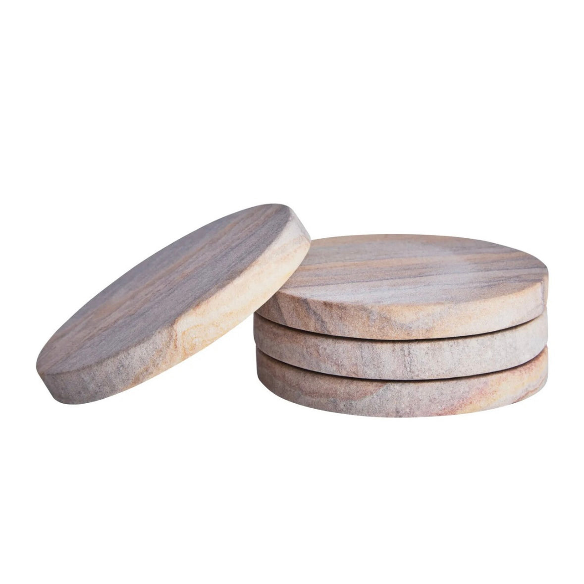 Each piece showcases unique organic patterns and subtle tonal variations, making every coaster beautifully individual. Crafted from solid sandstone, they offer both practicality and style—protecting surfaces from heat and spills while adding a refined, earthy touch to your setting.