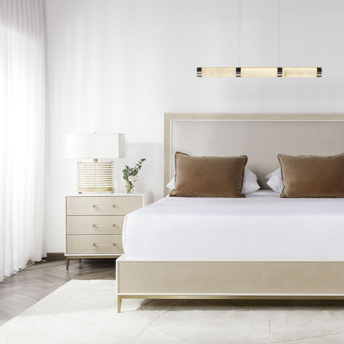 Alice expresses understated opulence with a frame of faux shagreen supported by a brass finished base and softened by the linen upholstered headboard. This contemporary bed elegantly mixes textures and materials in a soothing neutral colour palette, creating a soft and versatile piece. Strong, individual wooden slat mattress base, that enables the matress to lay flat on top of it. (Please Note: Construction of the bed is not included in delivery).