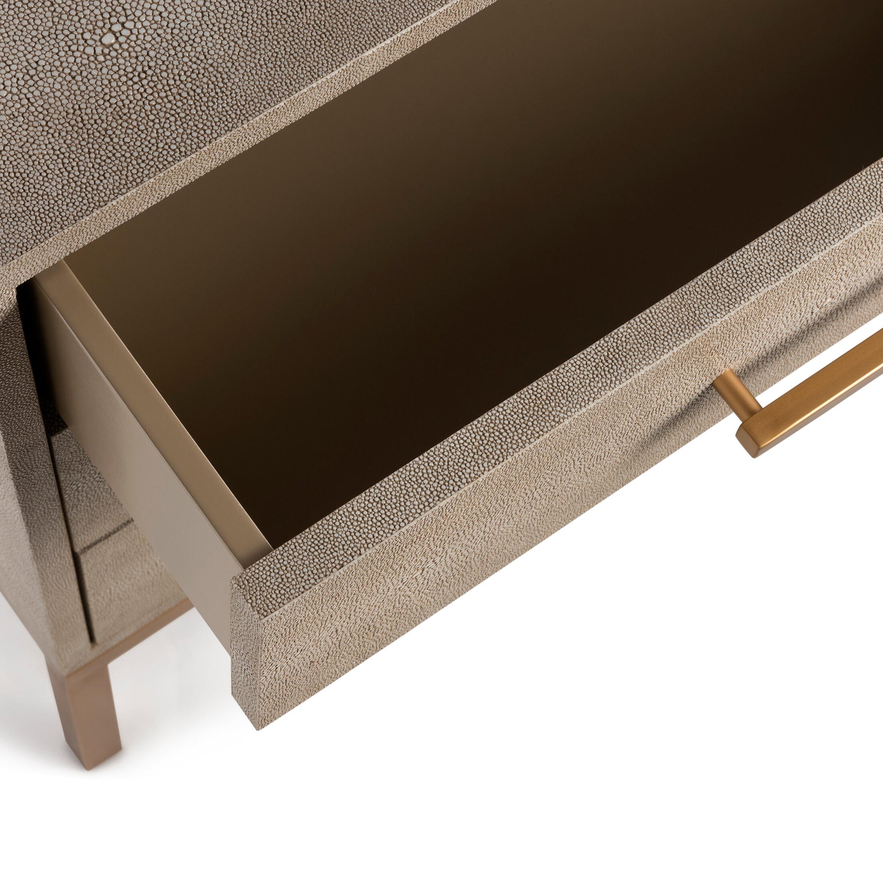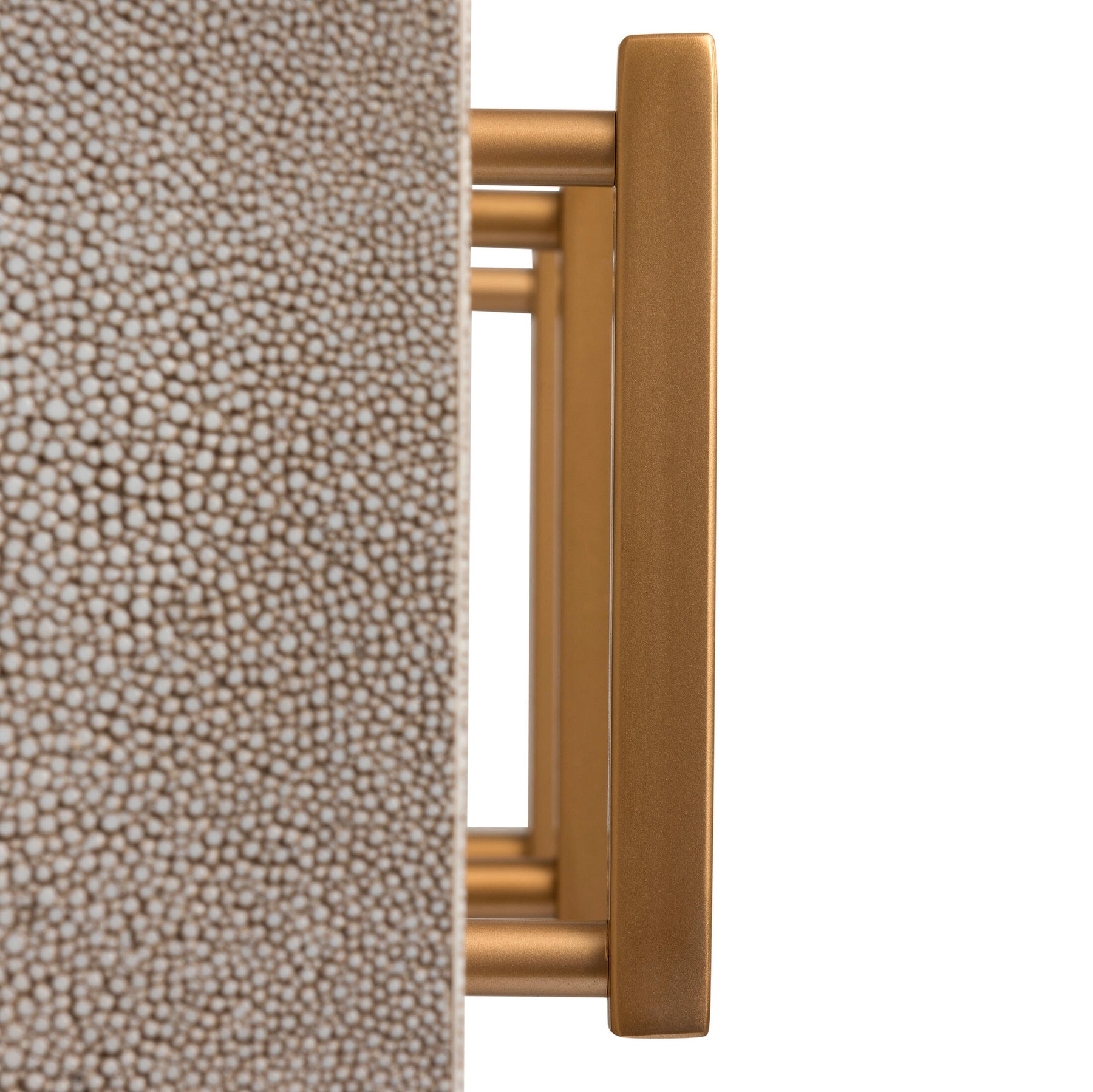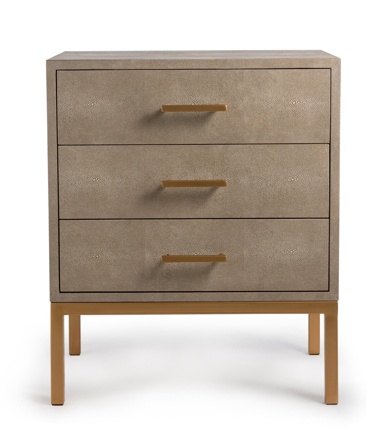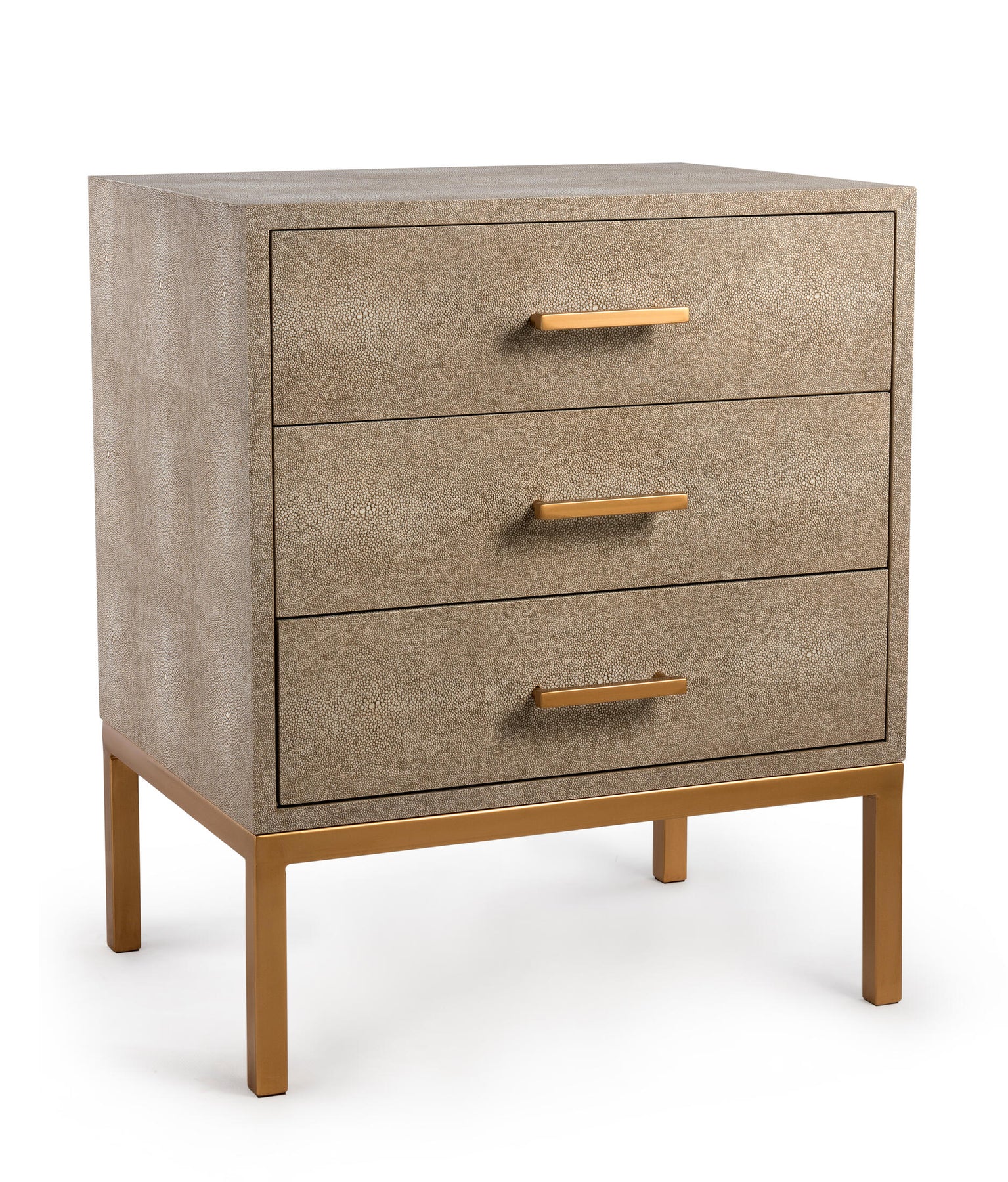 Jasper Side Chest boasts a classy faux shagreen finish in cream with matt gold legs and handles to match. Three pull out, soft close drawers make this side table practical as well as stylish and sophisticated. Perfect for a bedside table paired with a lamp that gives off warm, yellow lighting.