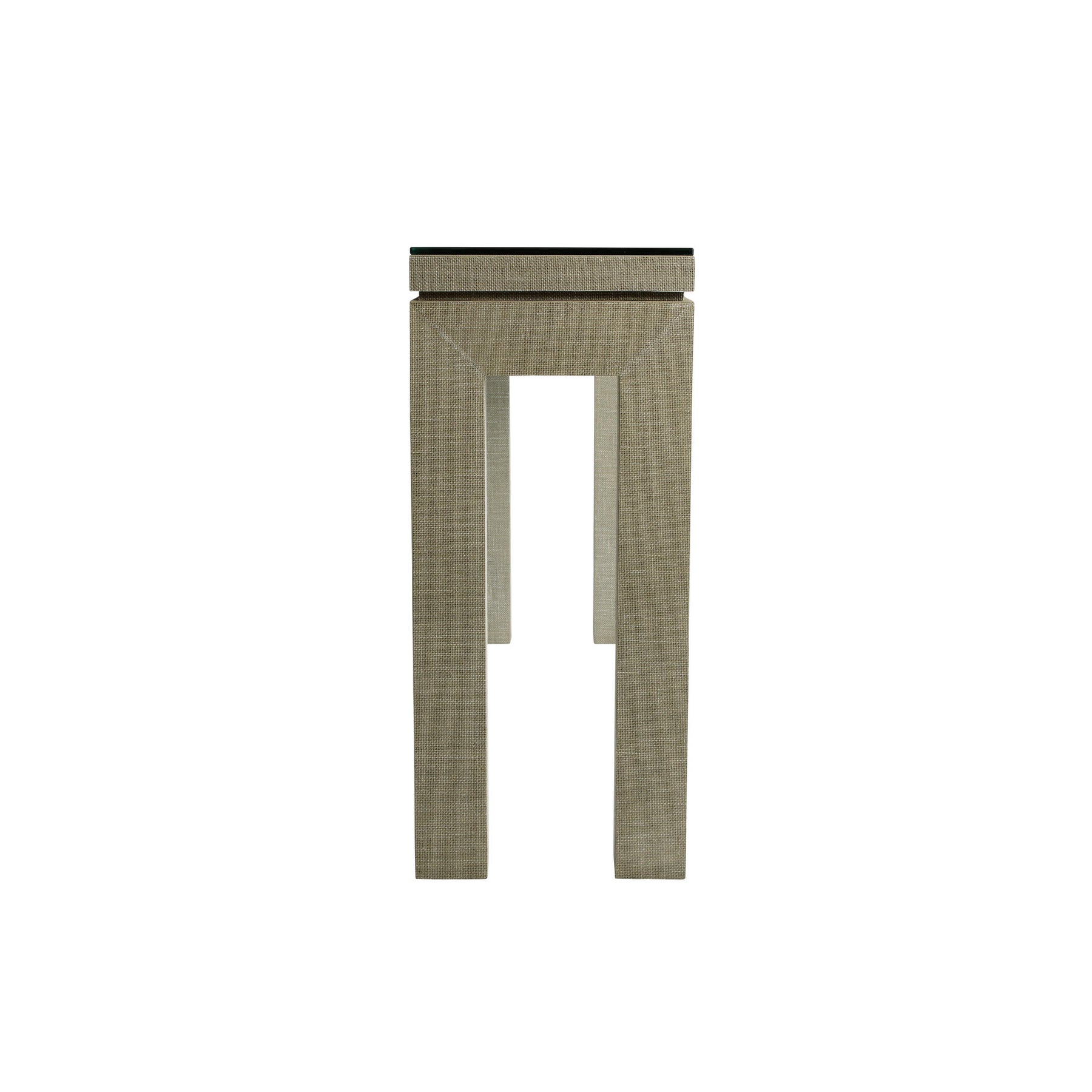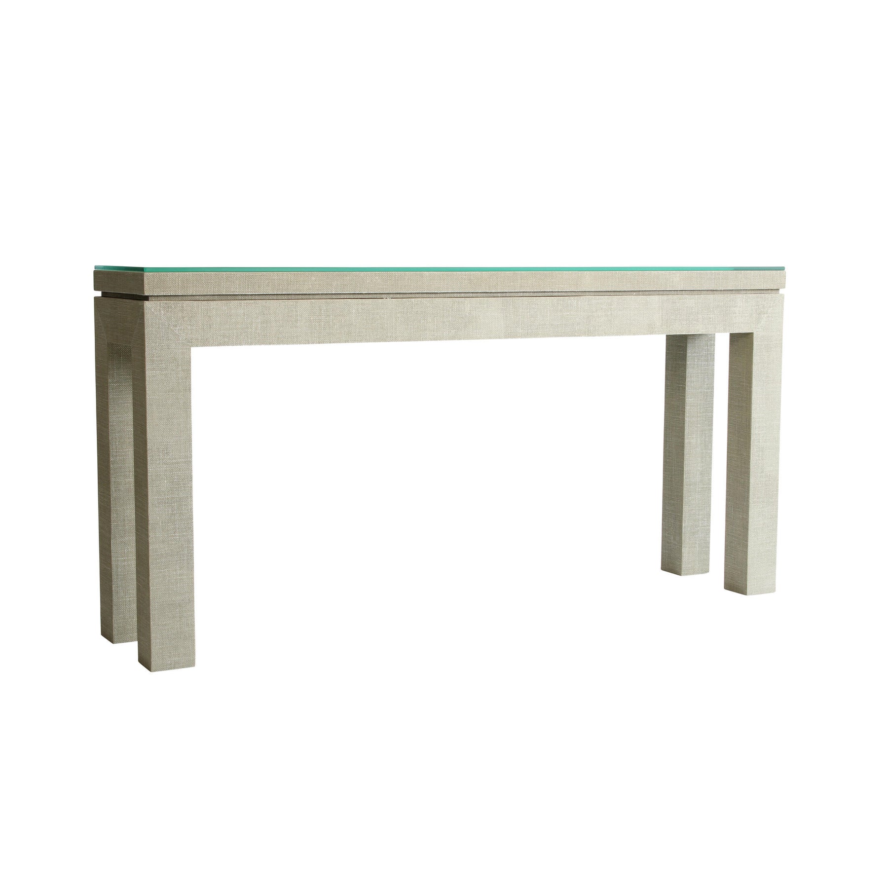 This elegant console table features a light cement-coloured base with a subtle textured finish and a clear glass top. It showcases clean, architectural lines and solid, square legs that give it a strong yet elegant presence.