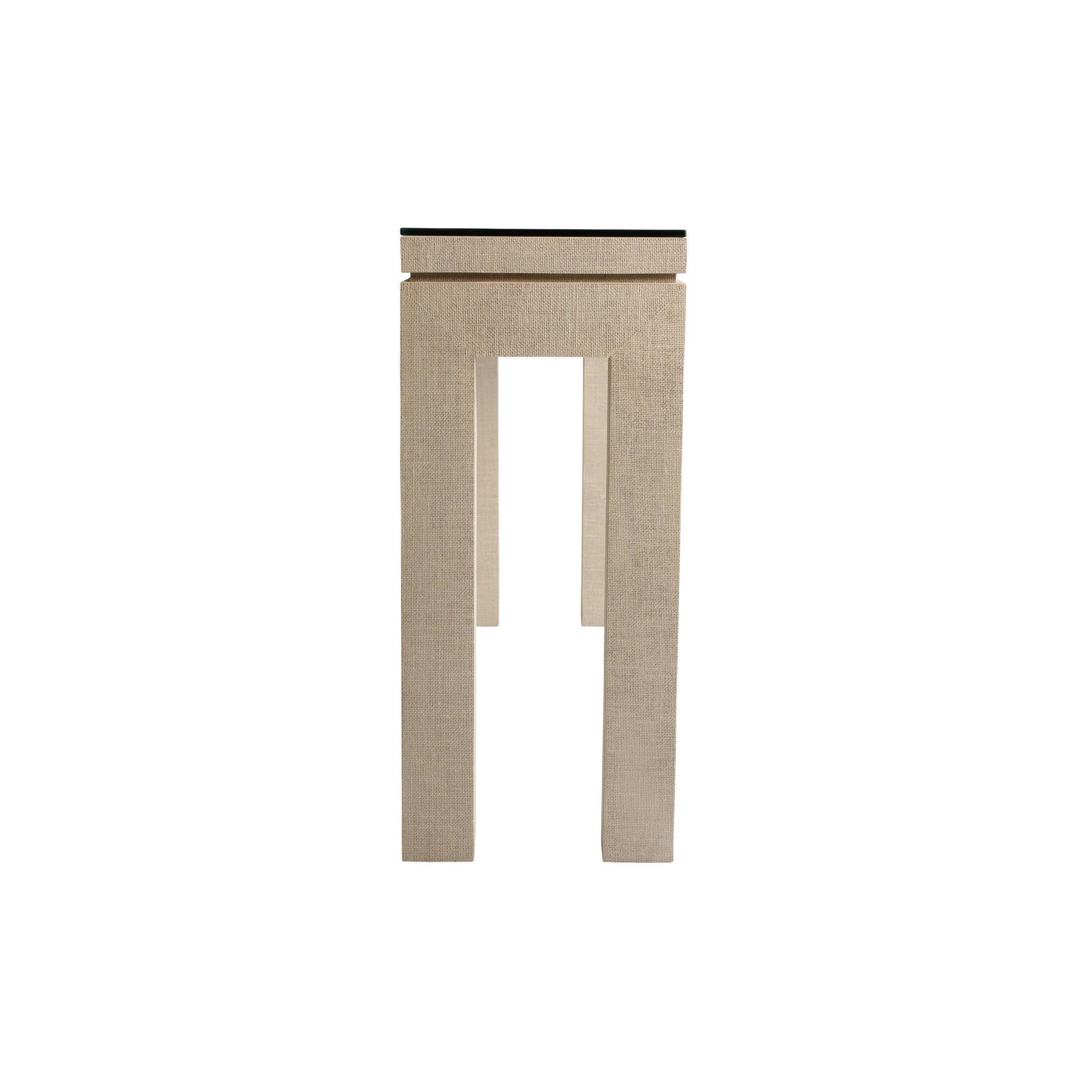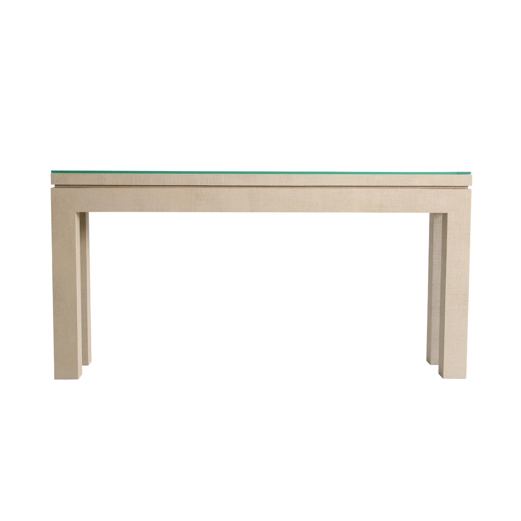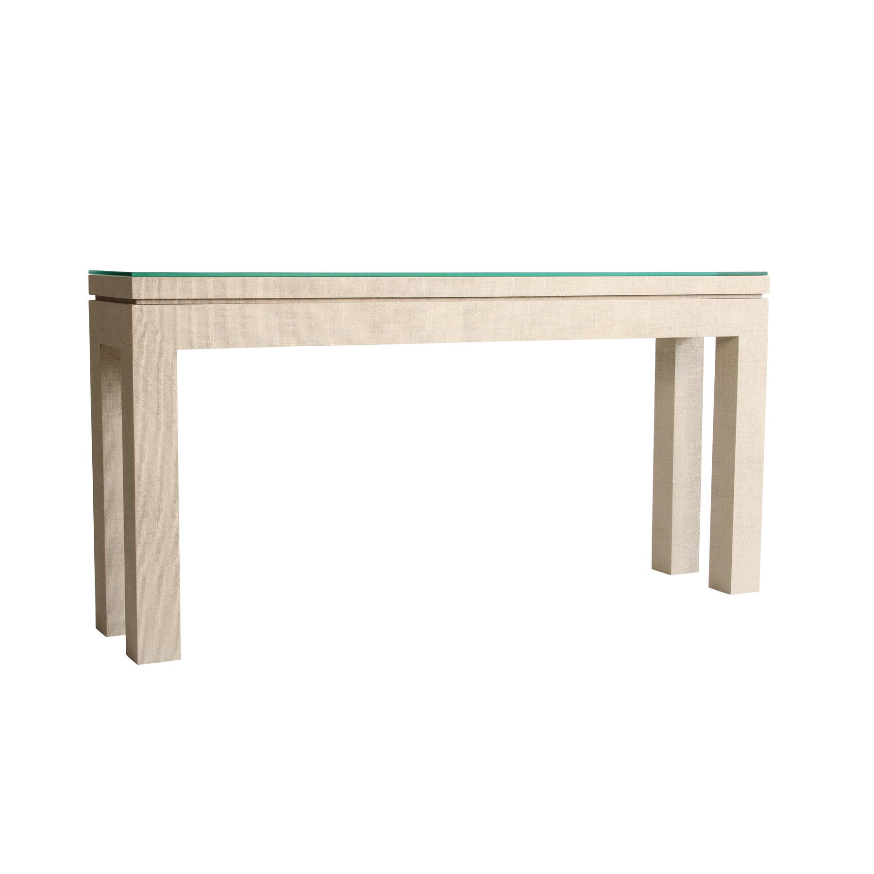This elegant console table features a cream-coloured base with a subtle textured finish and a clear glass top. It showcases clean, architectural lines and solid, square legs that give it a strong yet elegant presence.