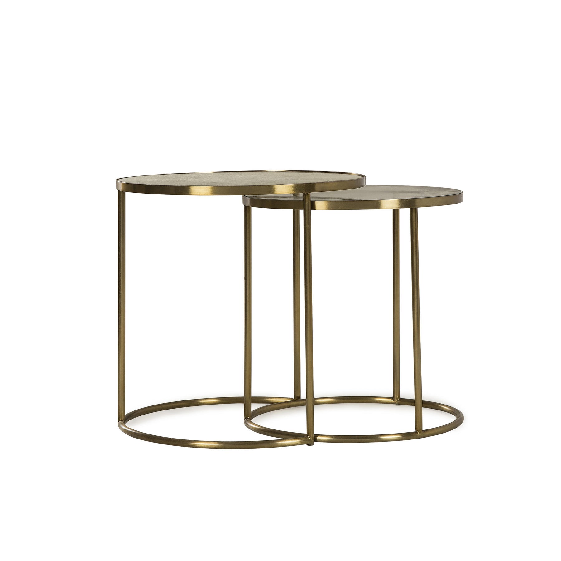 An opulent pair of nesting side tables with beautiful satin brass frames. One with a pearlized shagreen top and the other with clear glass. Compliment a contemporary luxe design scheme with this eye-catching piece.