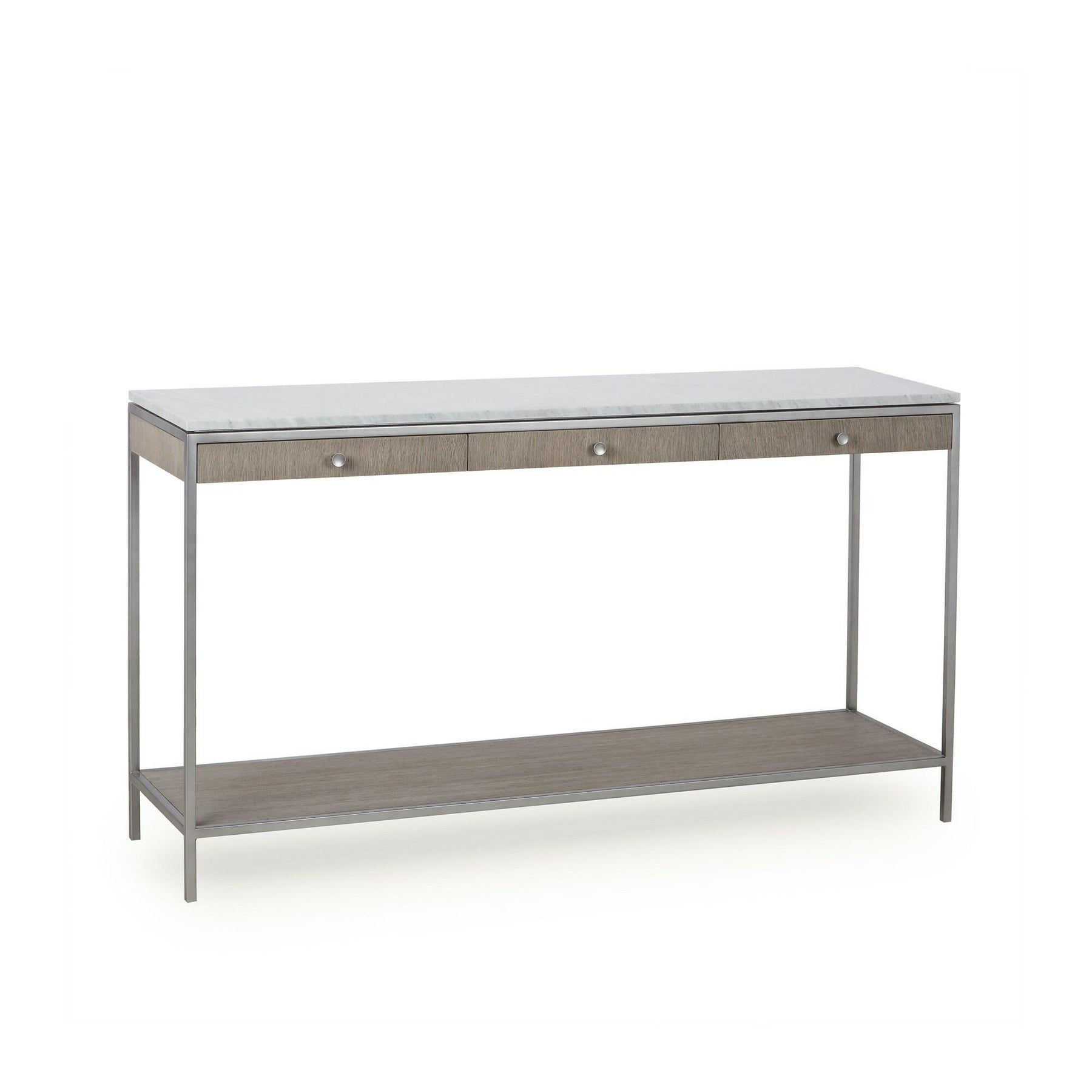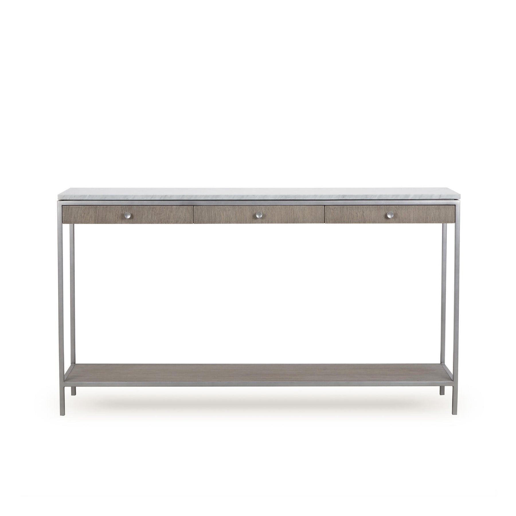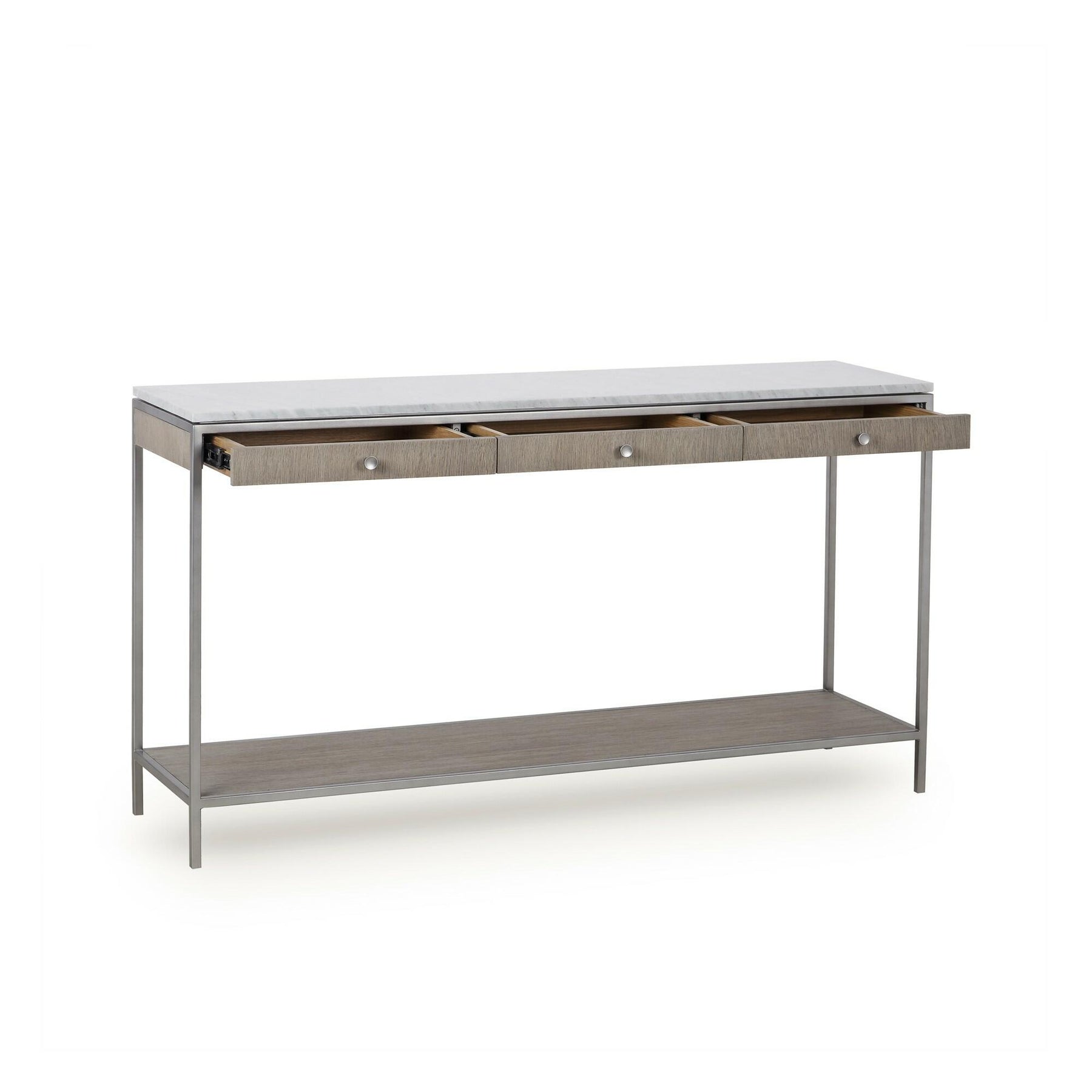 Convey effortless elegance with this two-tone console table crafted from a sleek steel frame finished in a brushed nickel, with open grain silver oak drawers and a polished white marble top. This piece will perfectly compliment a neutral room or stand out in a maximalist space.