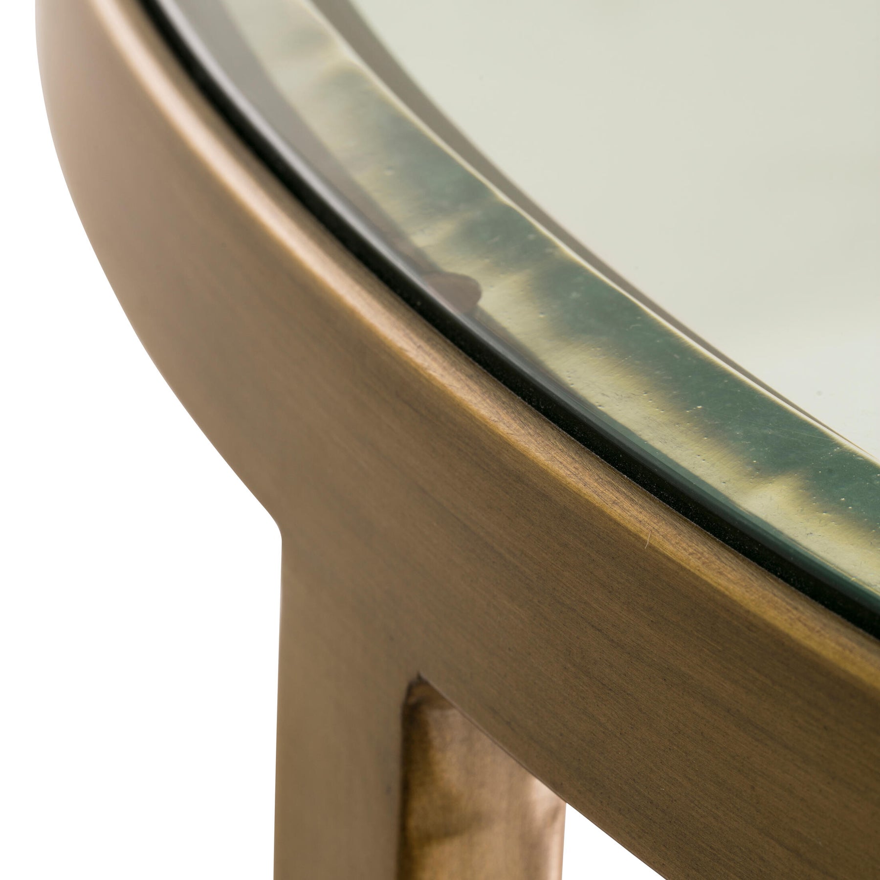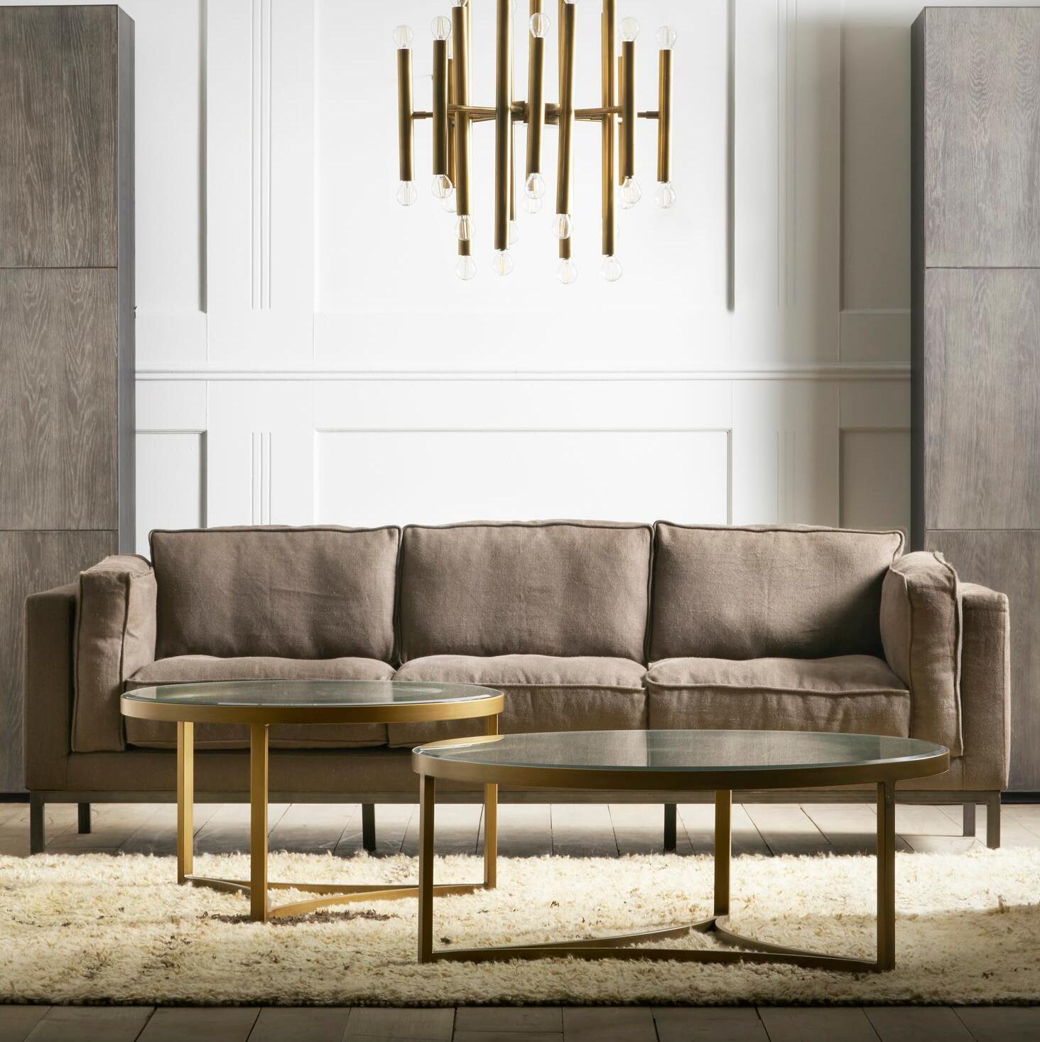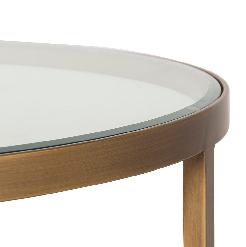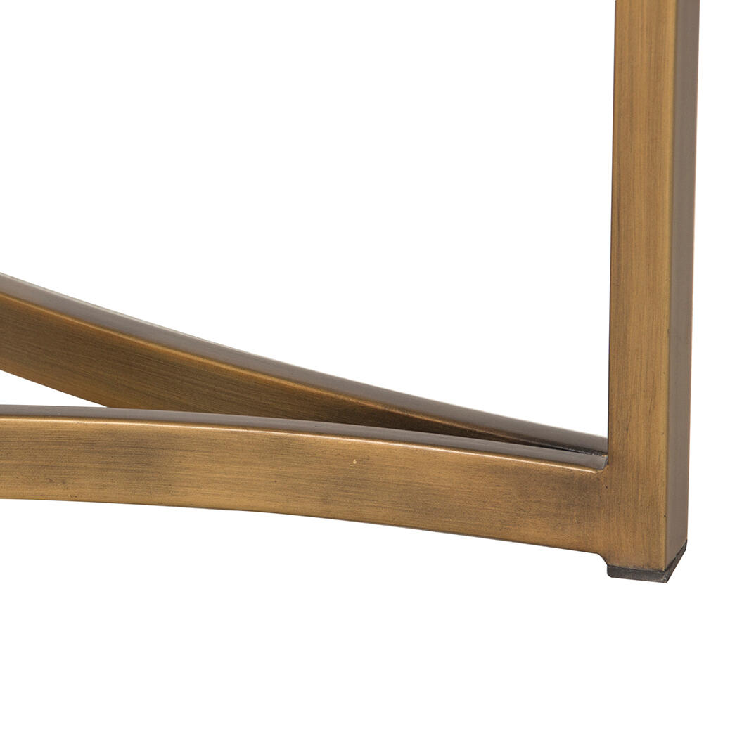 Sundance plays with curving lines. With a glinting antique brass finish, the circular frame of the top inverses underneath to display three concave lines its base. The tempered glass top is cool and classy and allows the round sun-inspired design to shine through. Available in a medium or large size.