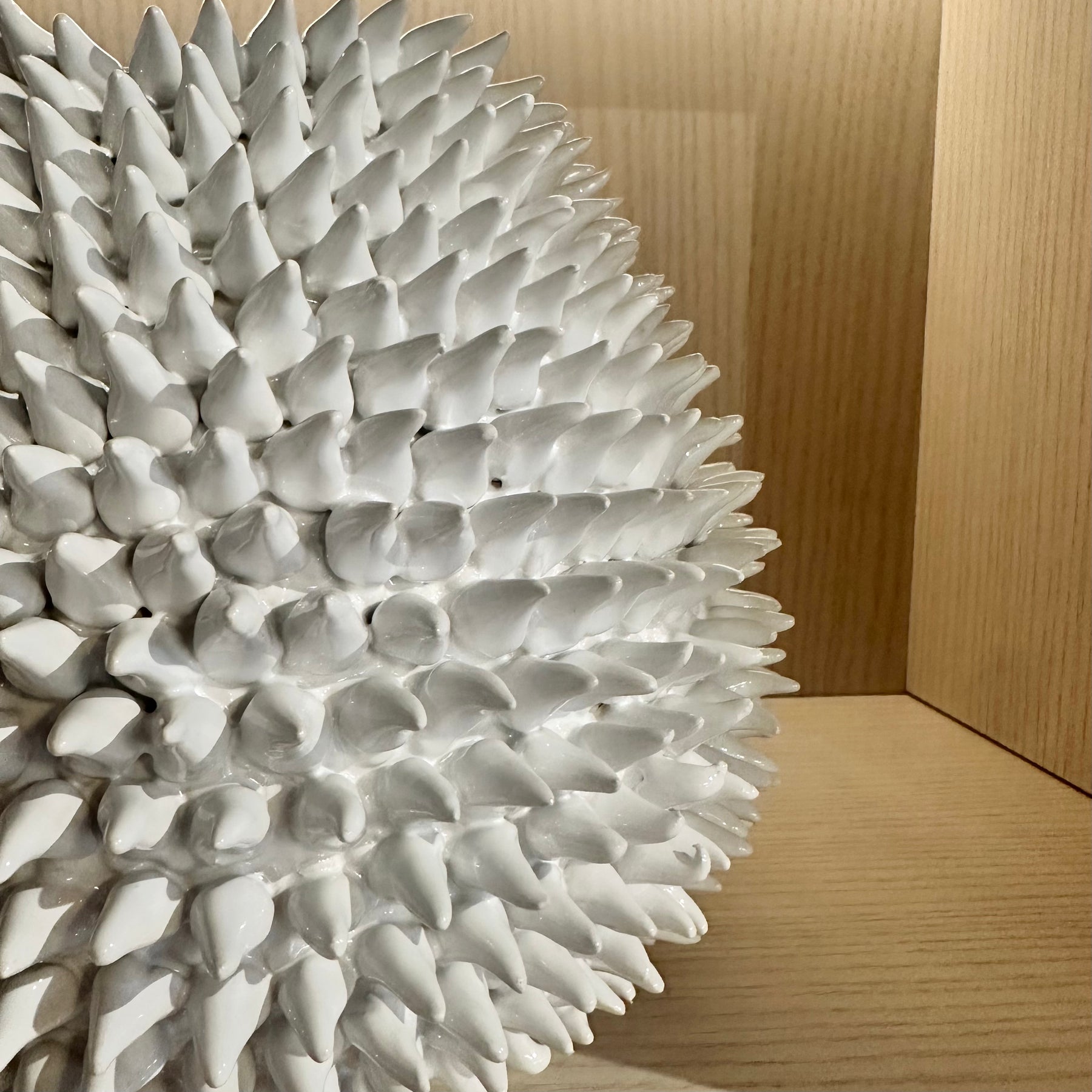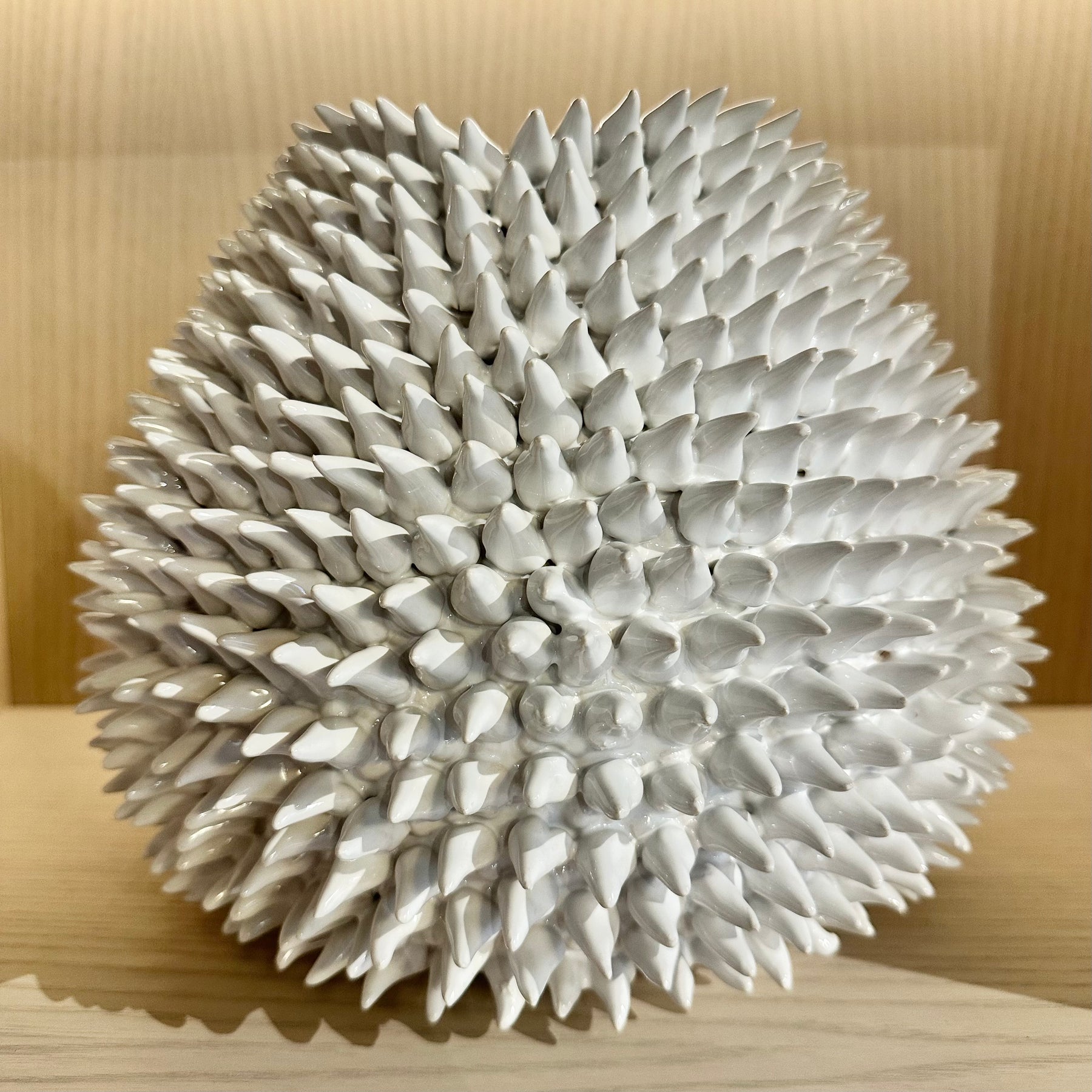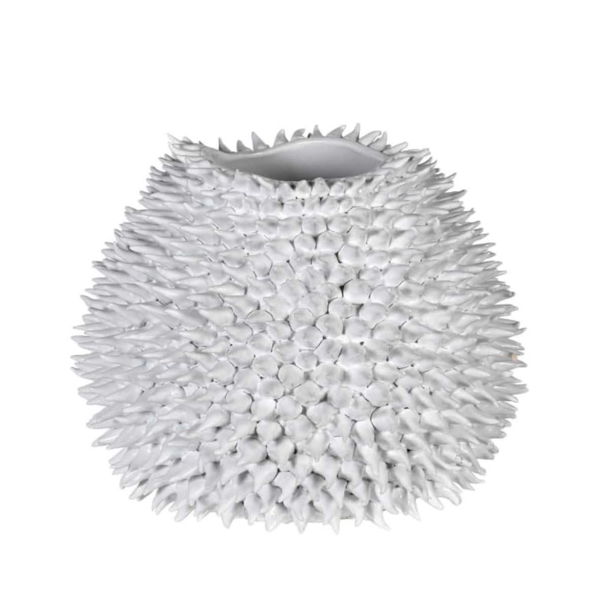 Bold and artistic, this white ceramic vase features a striking spiked texture reminiscent of sea urchins or coral. Its sculptural design makes it a captivating statement piece for contemporary interiors.