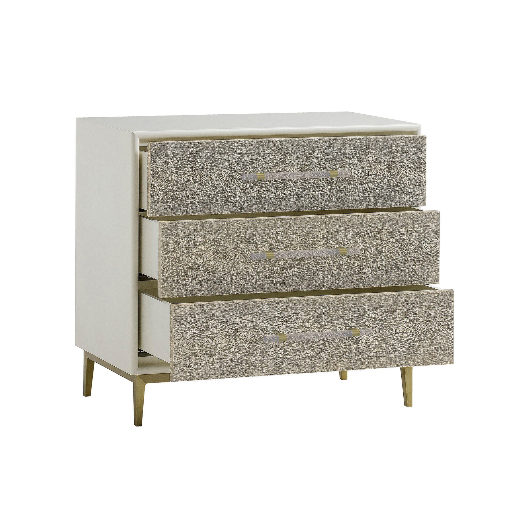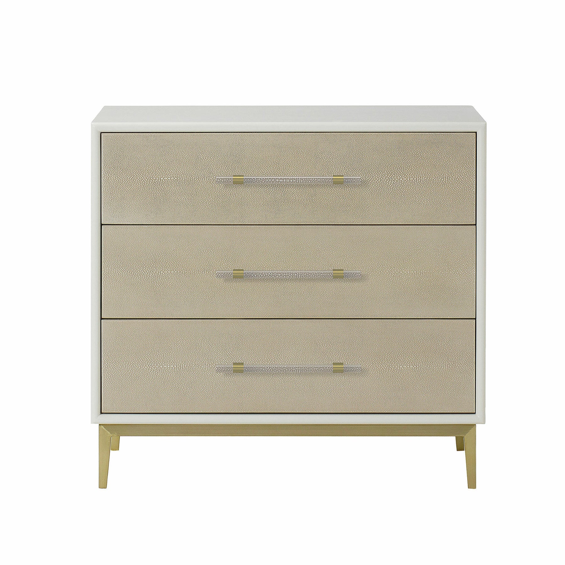 Alice boasts three faux shagreen drawers complimented by solid Perspex handles, encased in a white painted frame and perched elegantly on antique brass finish legs. This sophisticated piece offers ample storage space, whilst the neutral colours and simple silhouette give it a timeless and versatile feel to suit a range of interiors.