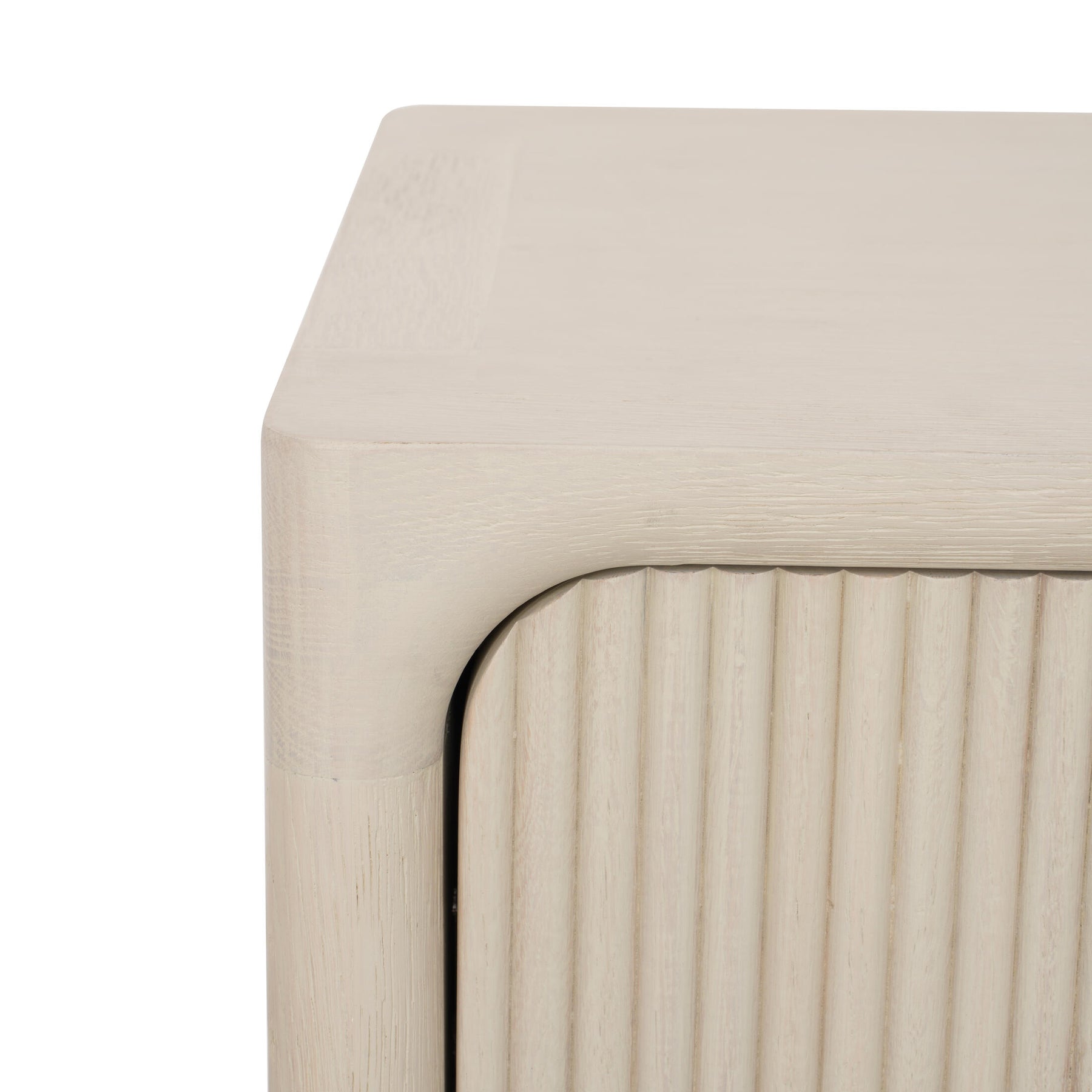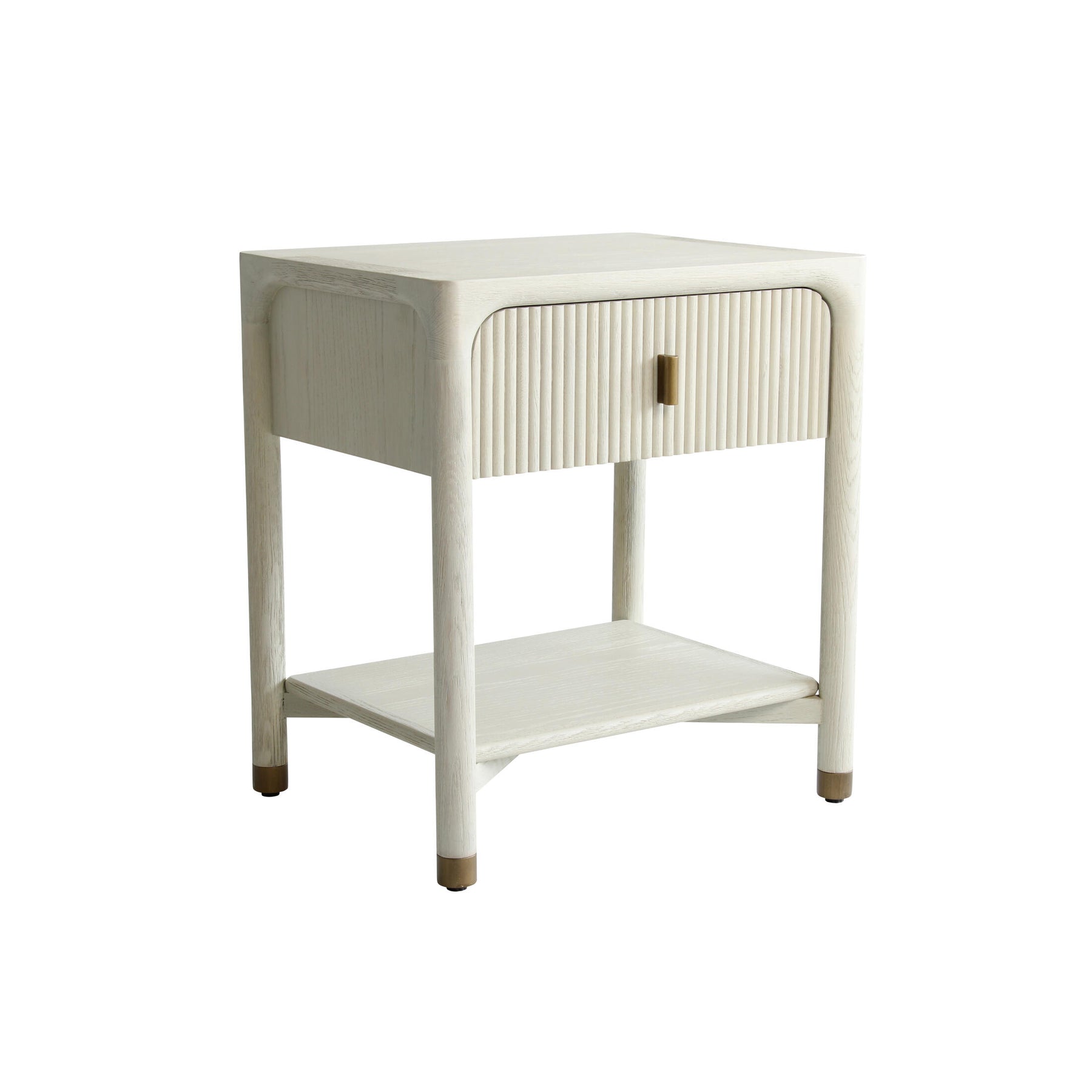 Elegant yet quietly expressive, this bedside table brings texture and craftsmanship to your restful space. Made from solid wood and finished in a soft painted tone, it strikes the perfect balance between contemporary calm and artisanal charm. The gently rounded edges and fluted drawer front create a tactile rhythm that adds depth and character to its compact form.