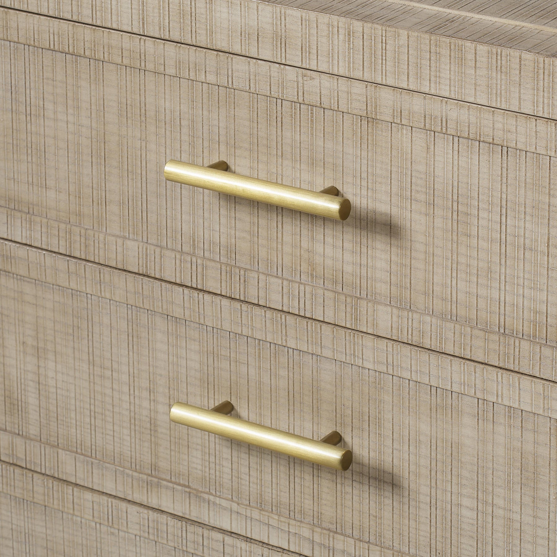 Create an air of sophistication in your bedroom with the Raffles nightstand, crafted from a textured multi-directional mix of ash solids and veneers that evoke the impression of a rough woven linen. Complete with 3 drawers finished with elegant brass finish handles.