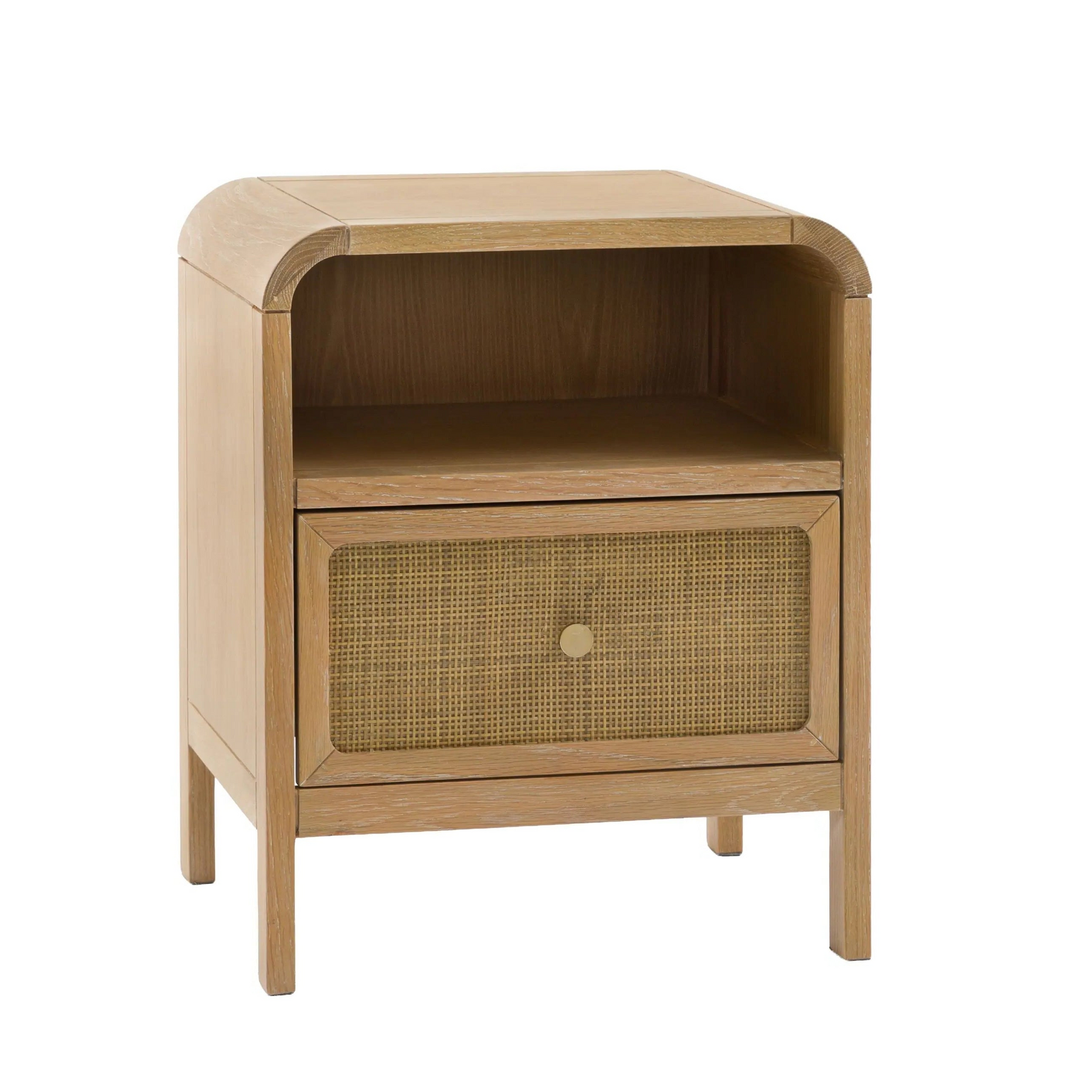 Bring a touch of rustic charm with this beautifully crafted bedside table, blending oak solids, veneers, and solid rubberwood timbers for durability and warmth. The standout feature being the natural hand-woven rattan, adding texture and an artisanal feel. Finished in a soft lime-washed tone, the collection has a relaxed, lived-in character. Gently curved tops lend a sense of softness, while bronzed metal handles add a subtle vintage touch. Perfect for creating a calming, timeless bedroom space with natural beauty at its heart.
