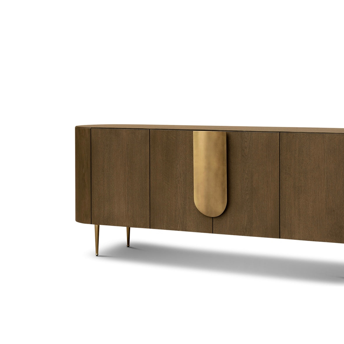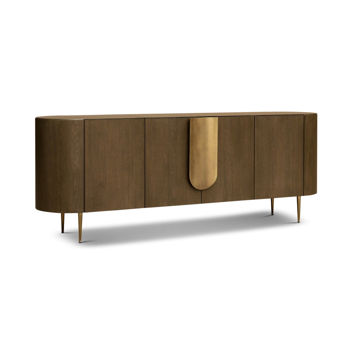 The Napa Large Sideboard has 4 doors and comes in a textured caramel oak veneer with bronze handles. With its curved and unique design, the Napa Sideboard can help achieve the perfect finish in any home or interior design project.