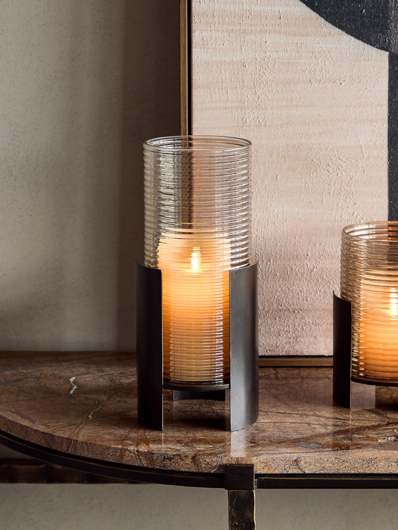 Sleek and sculptural, the Belvedere Black Ribbed Hurricane introduces a modern edge to ambient lighting. Crafted with a ribbed glass shade and encased in a striking black metal frame, it diffuses candlelight beautifully to create a warm, atmospheric glow. The tall silhouette and textural contrast make it a standout piece on consoles, dining tables, or fireplaces.