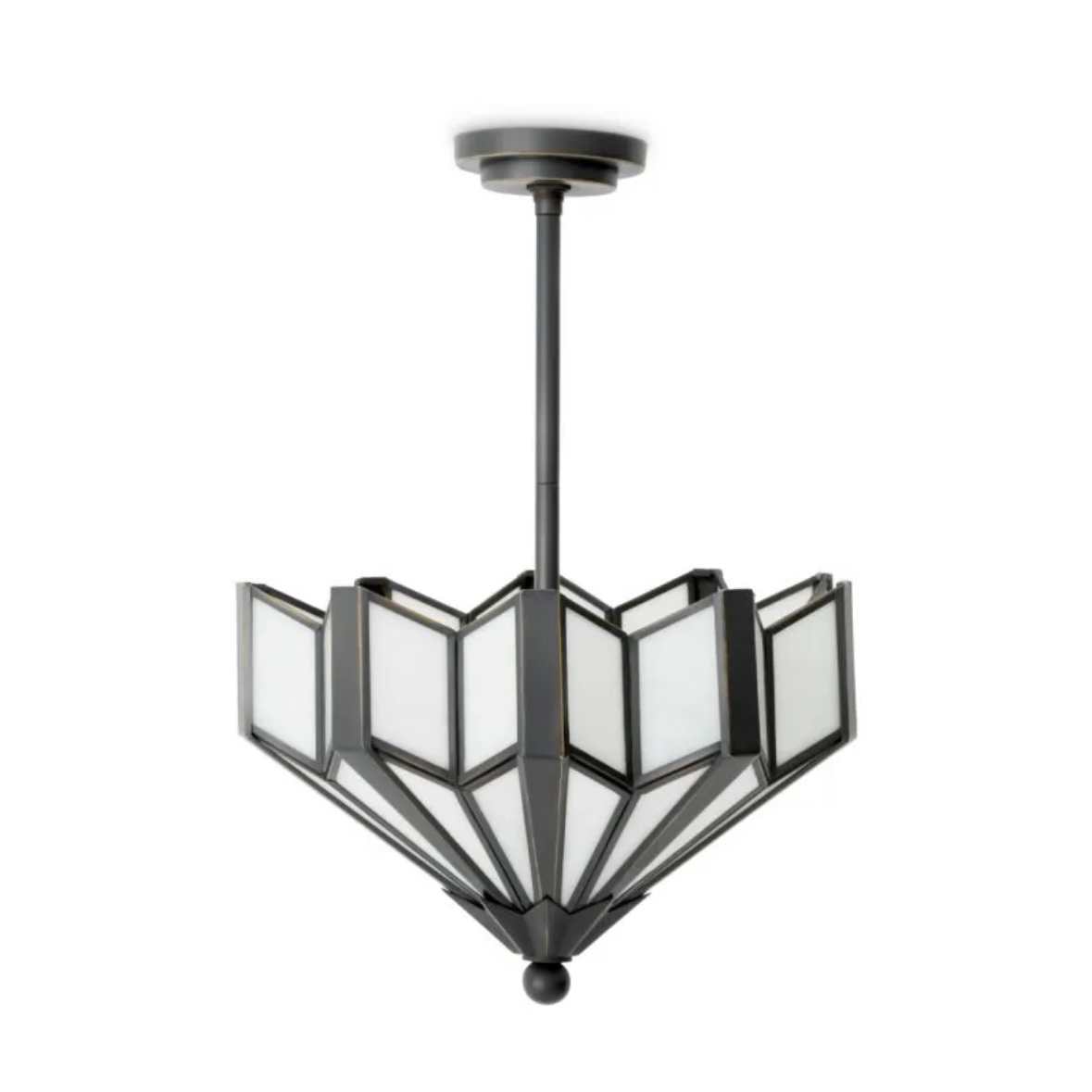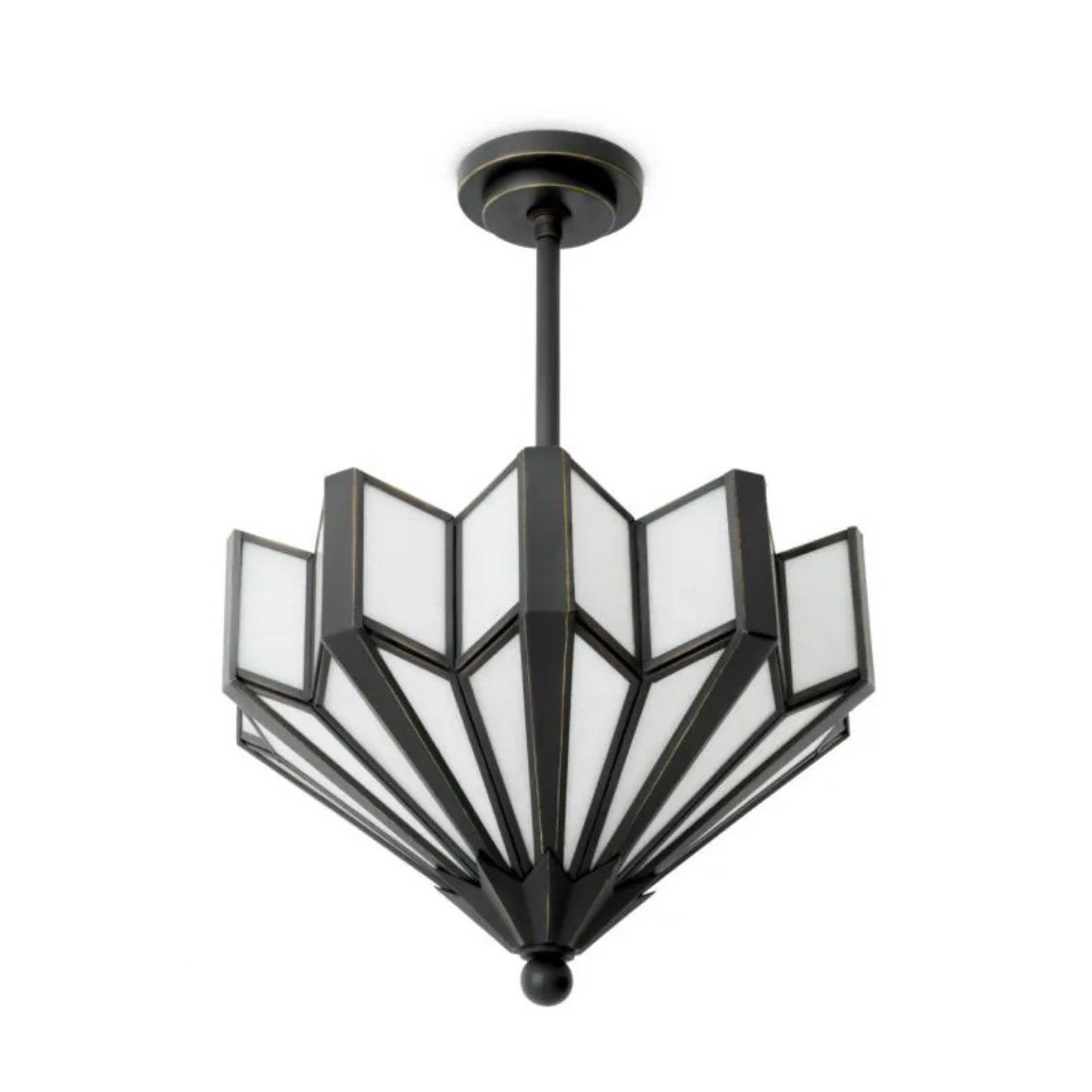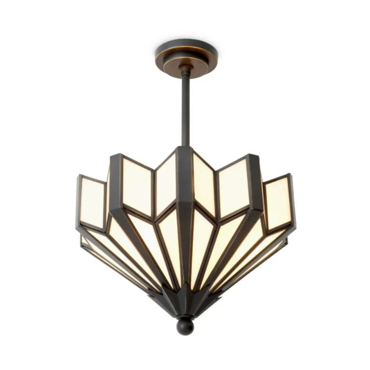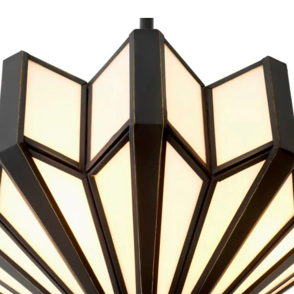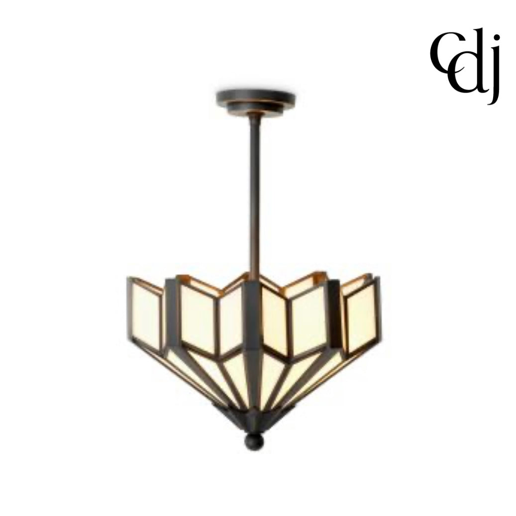 A striking tribute to Art Deco design, the Victory Ceiling Lamp pairs bold geometry with timeless elegance. Its fan-shaped, tiered silhouette is inspired by iconic 1920s architecture, while alabaster-toned glass panels cast a soft, ambient glow. Dark metal framing adds contrast and definition, enhancing the sculptural form.