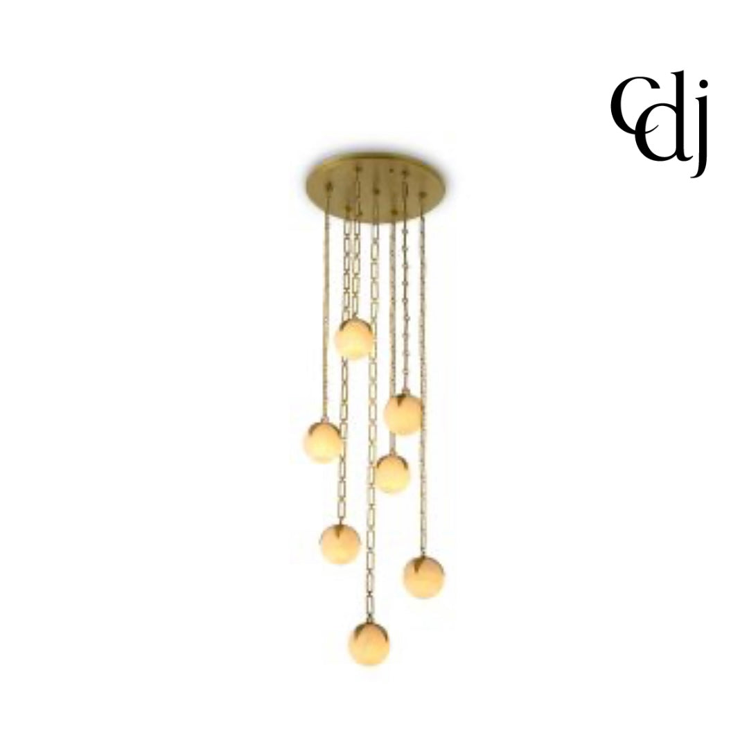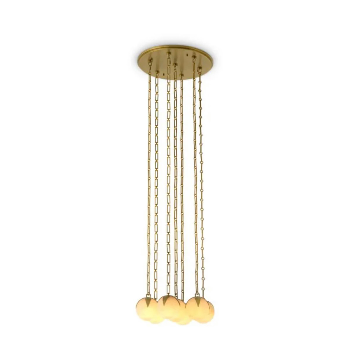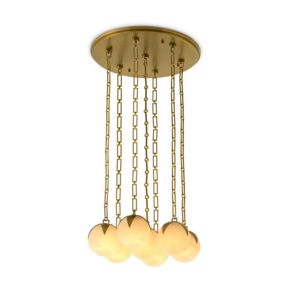 Alesa is a sculptural celebration of balance and light. Multiple alabaster globes, softly illuminated from within, hang at varying heights from a brass canopy, creating a composition that feels like a modern constellation. The warm brass finish highlights the natural veining of the stone, blending mid-century elegance with subtle Art Deco influence.