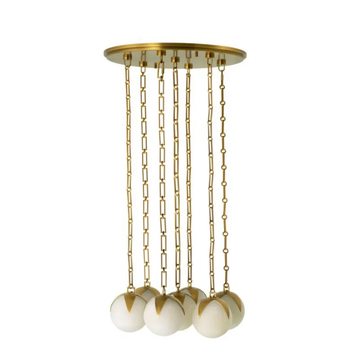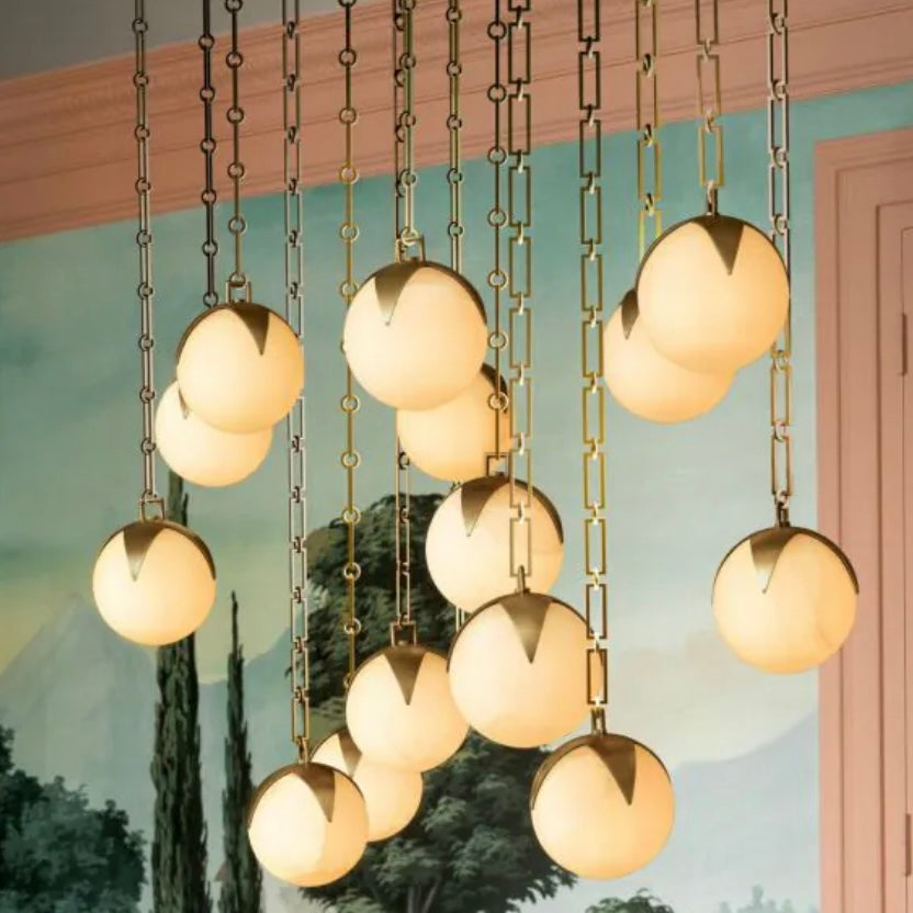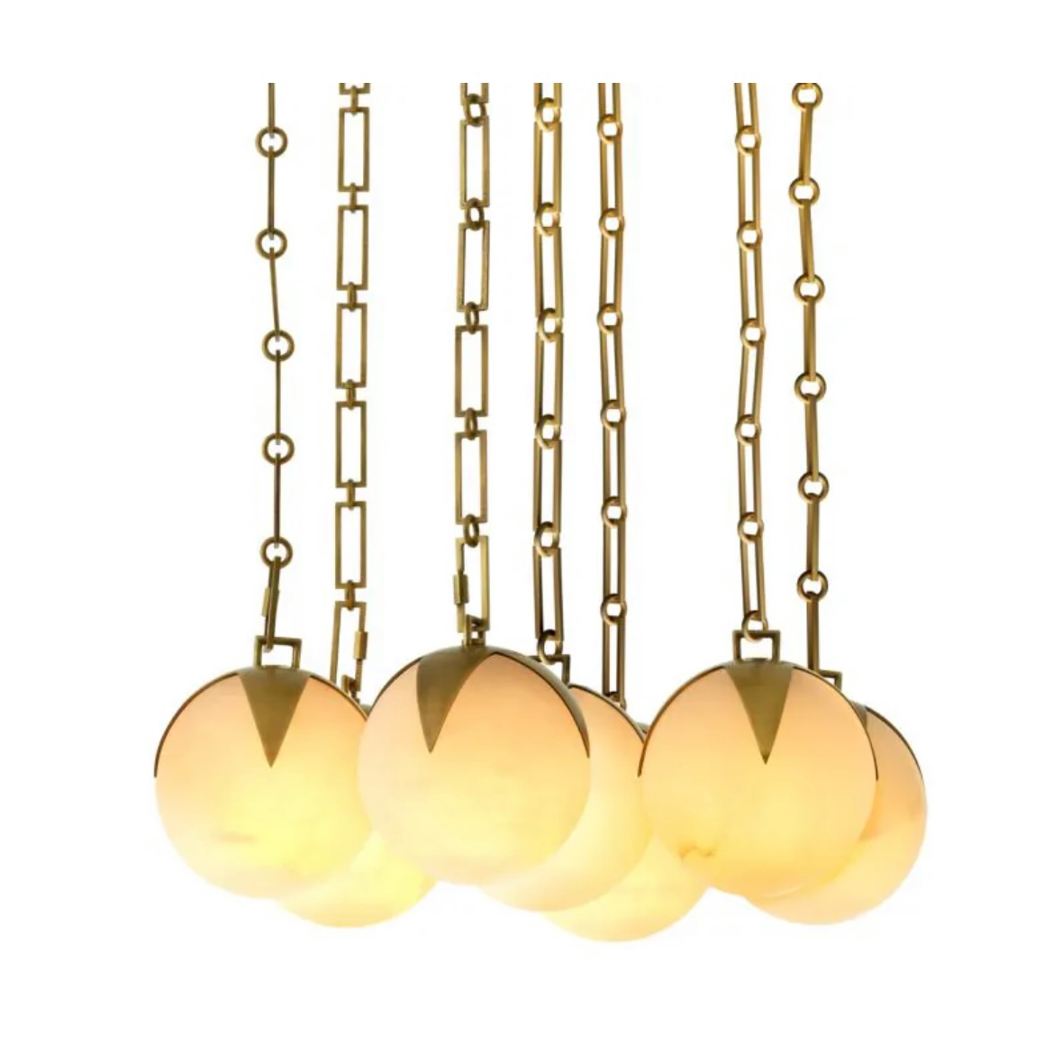 Alesa is a sculptural celebration of balance and light. Multiple alabaster globes, softly illuminated from within, hang at varying heights from a brass canopy, creating a composition that feels like a modern constellation. The warm brass finish highlights the natural veining of the stone, blending mid-century elegance with subtle Art Deco influence.