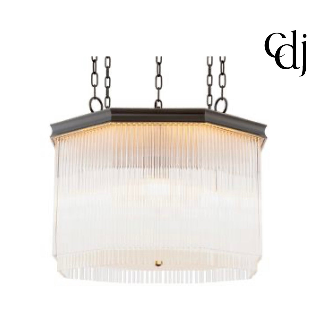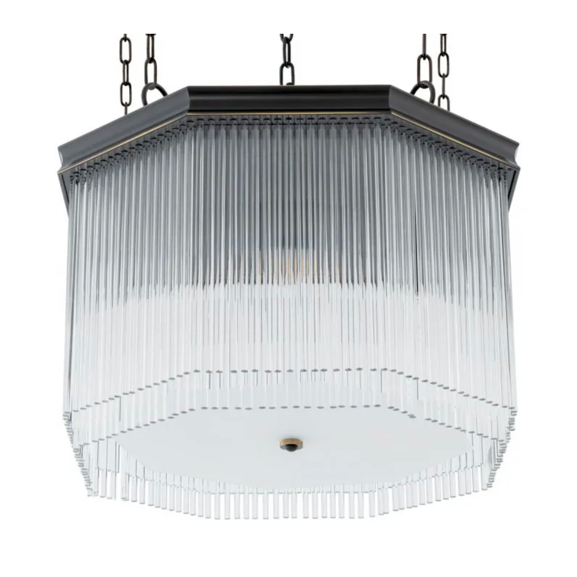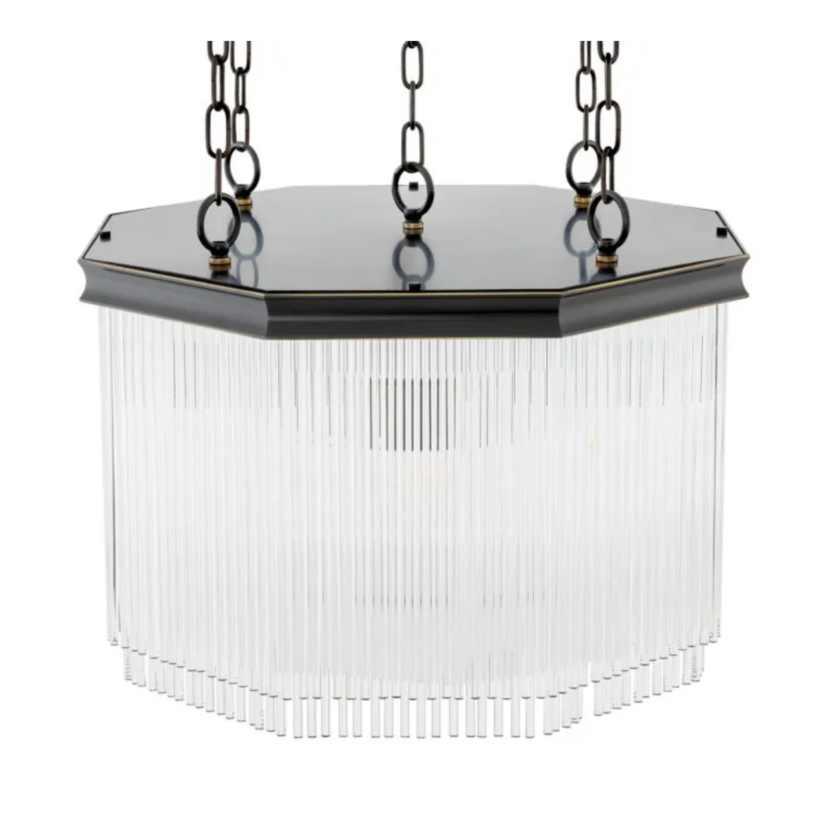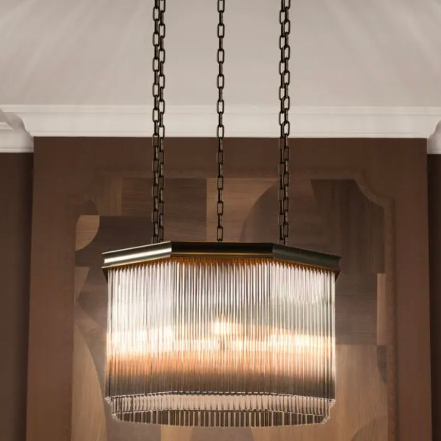An octagonal dark bronze frame supports cascading tiers of slender glass rods that shimmer as they diffuse light, creating a warm, atmospheric glow. Inspired by 1930s geometry and skyscraper silhouettes, Estela balances vintage elegance with contemporary sophistication — a sculptural statement piece for dining rooms, entryways, or grand living spaces.