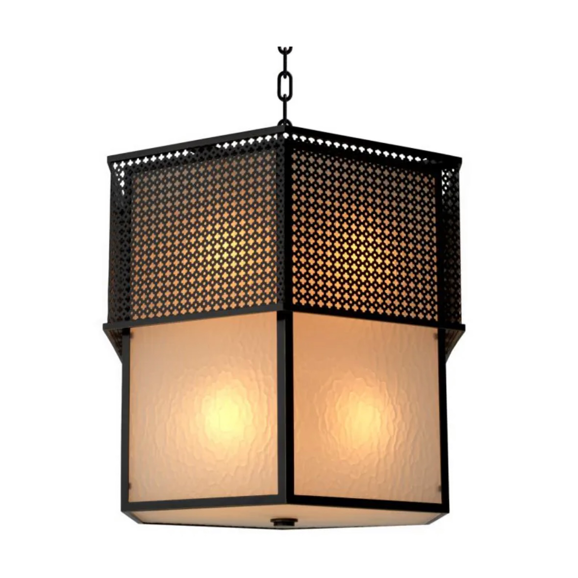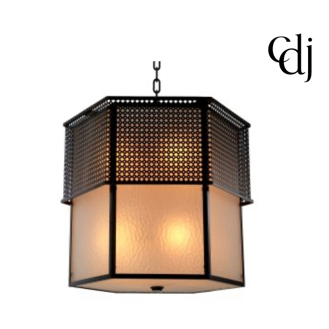 The Minerva Chandelier pairs a tiered hexagonal silhouette with dark metal framing and softly diffused glass panels. Inspired by Asian architectural symmetry and early industrial design, it casts a warm, tranquil glow while delivering strong geometric presence and sculptural balance.