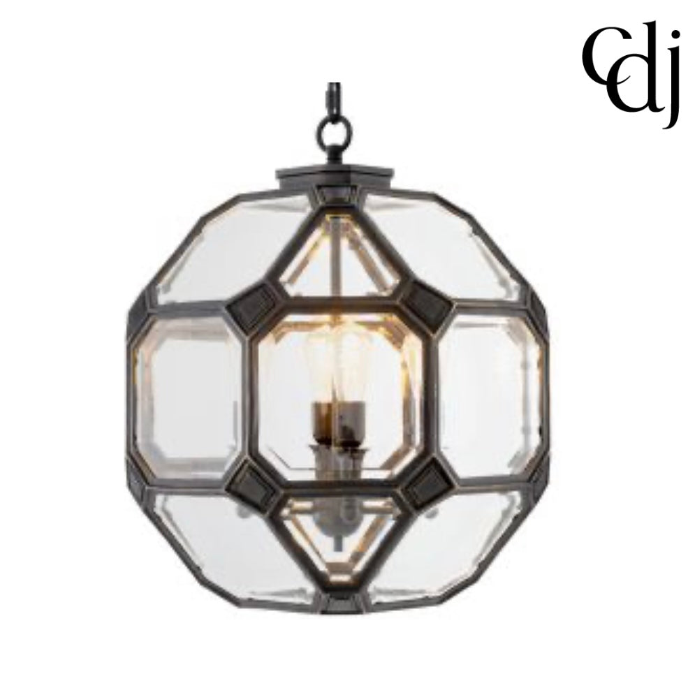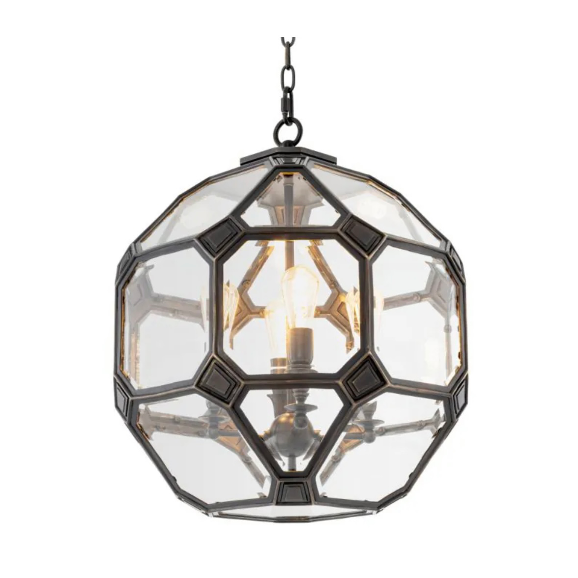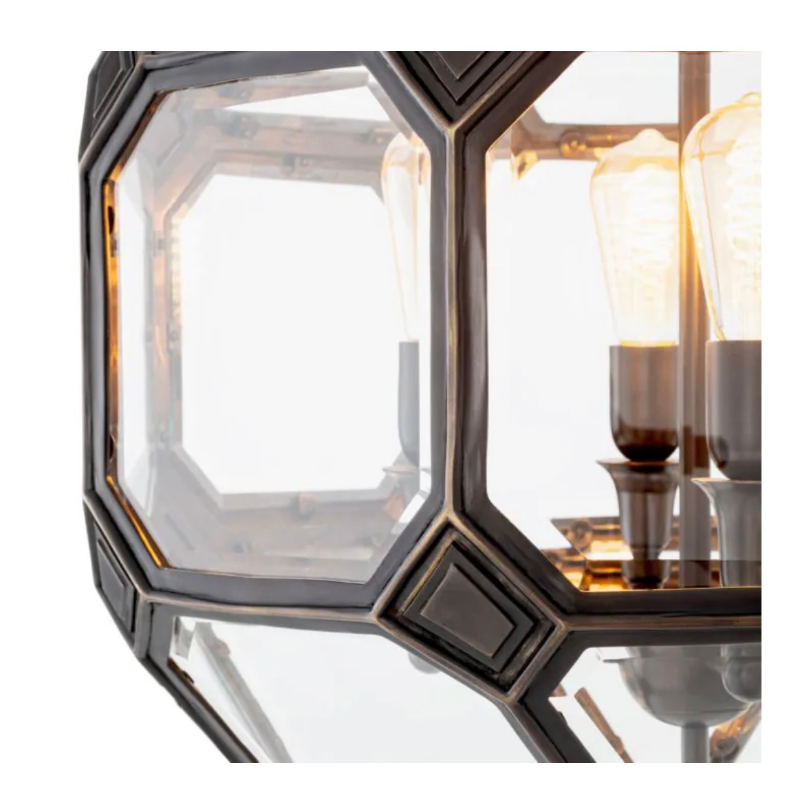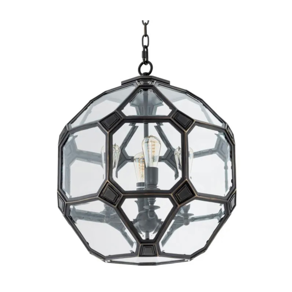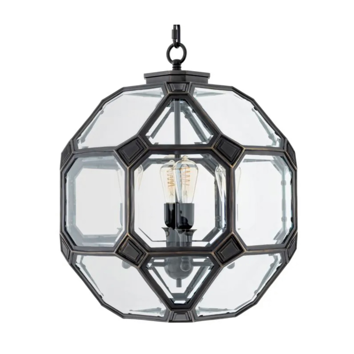 A striking study in geometry and light, the Olympia Lantern features a faceted metal frame and beveled glass panels that create a sculptural, globe-like form. Suspended bulbs glow from within, while reflections in the glass add depth and brilliance.