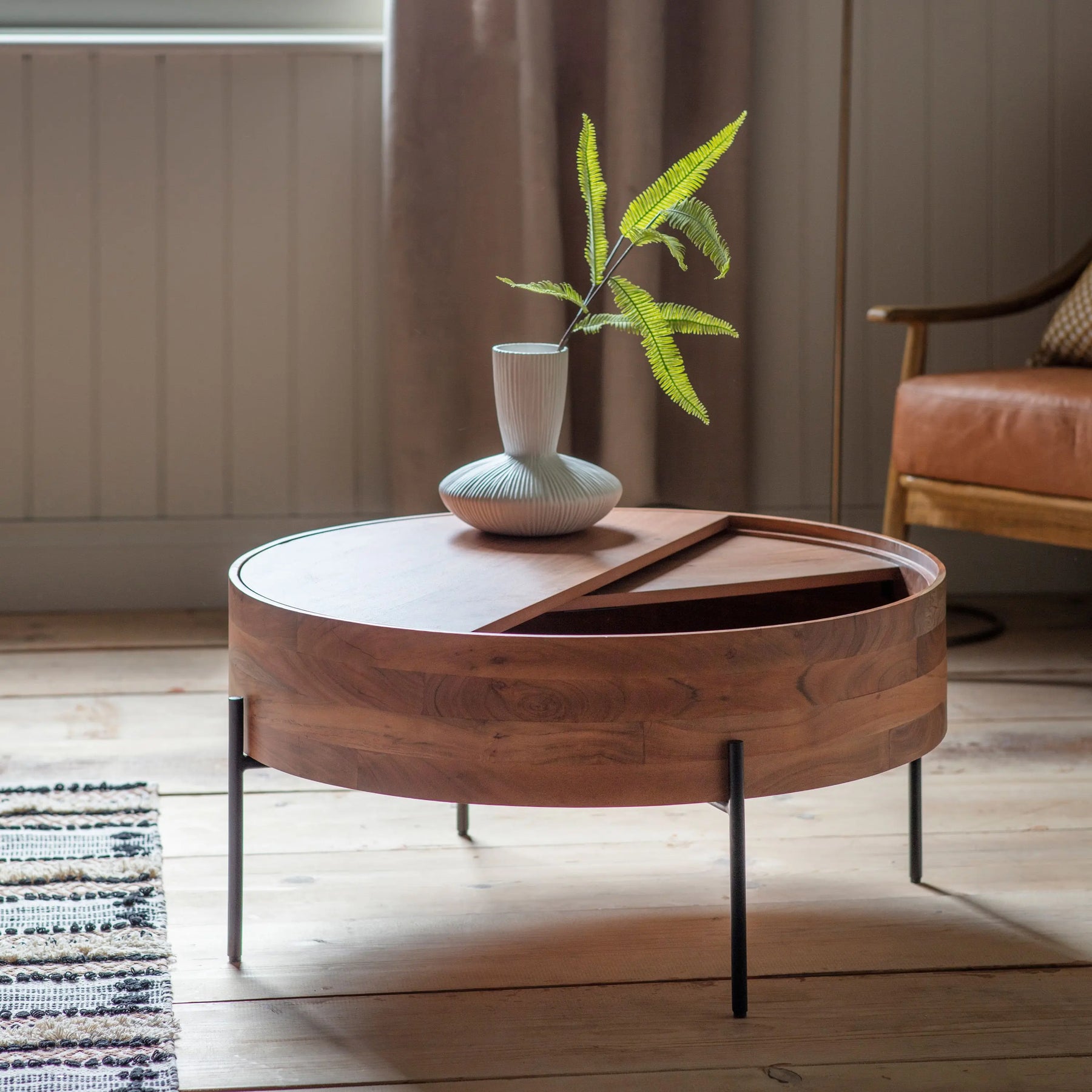 This unusual coffee table combines stylish looks with practicality. The cast rod metal legs echo the shape of the cylindrical top which is made from Acacia wood with a dry natural finish to highlight the grain of the wood. The clever design features a top that is divided in half, and the pieces slide round to reveal storage space underneath.