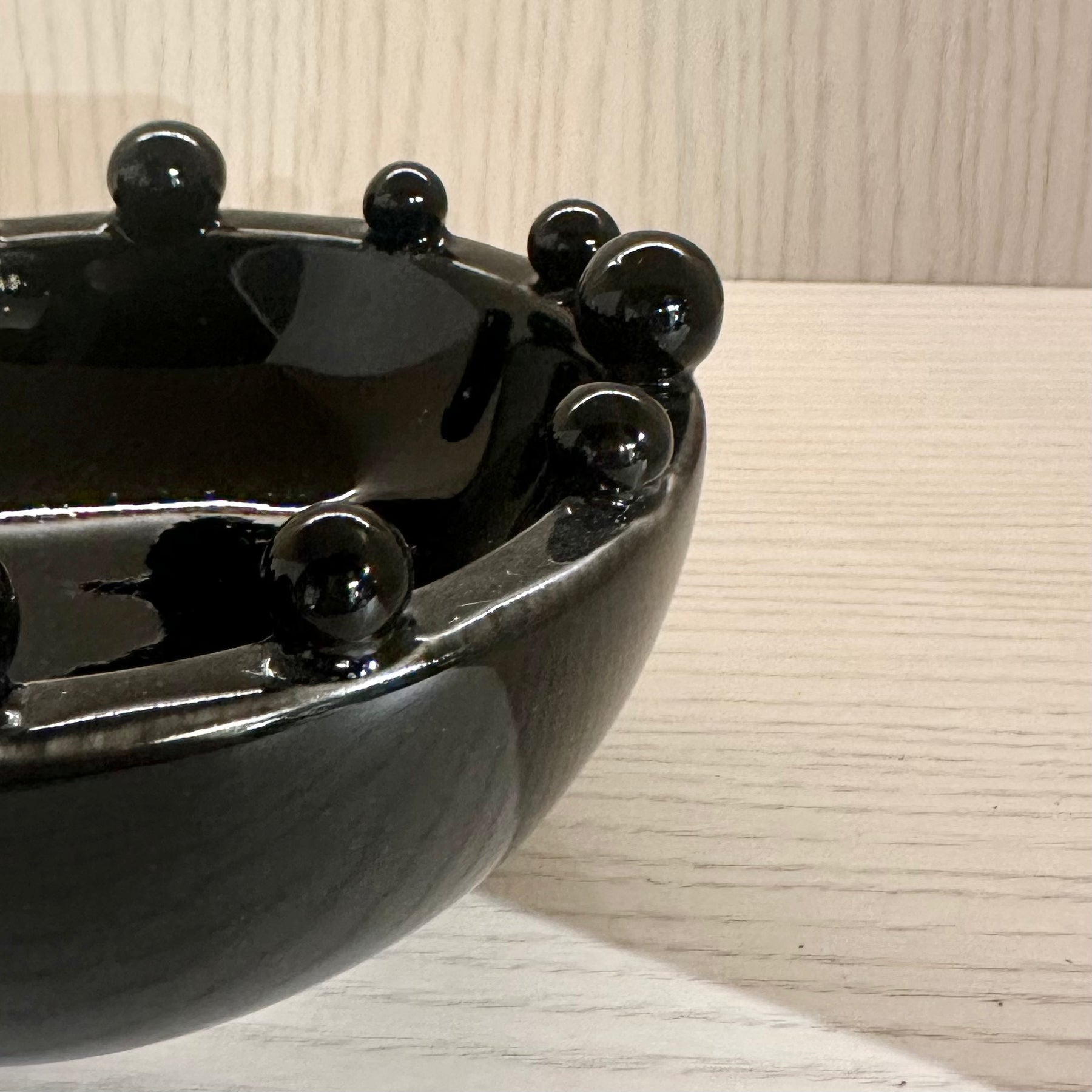 Bold and sculptural, the Mini Black Trinket Bobble Bowl adds a touch of modern statement style to any space. Its glossy black finish and distinctive bobble detailing create a striking accent piece that feels both playful and refined.