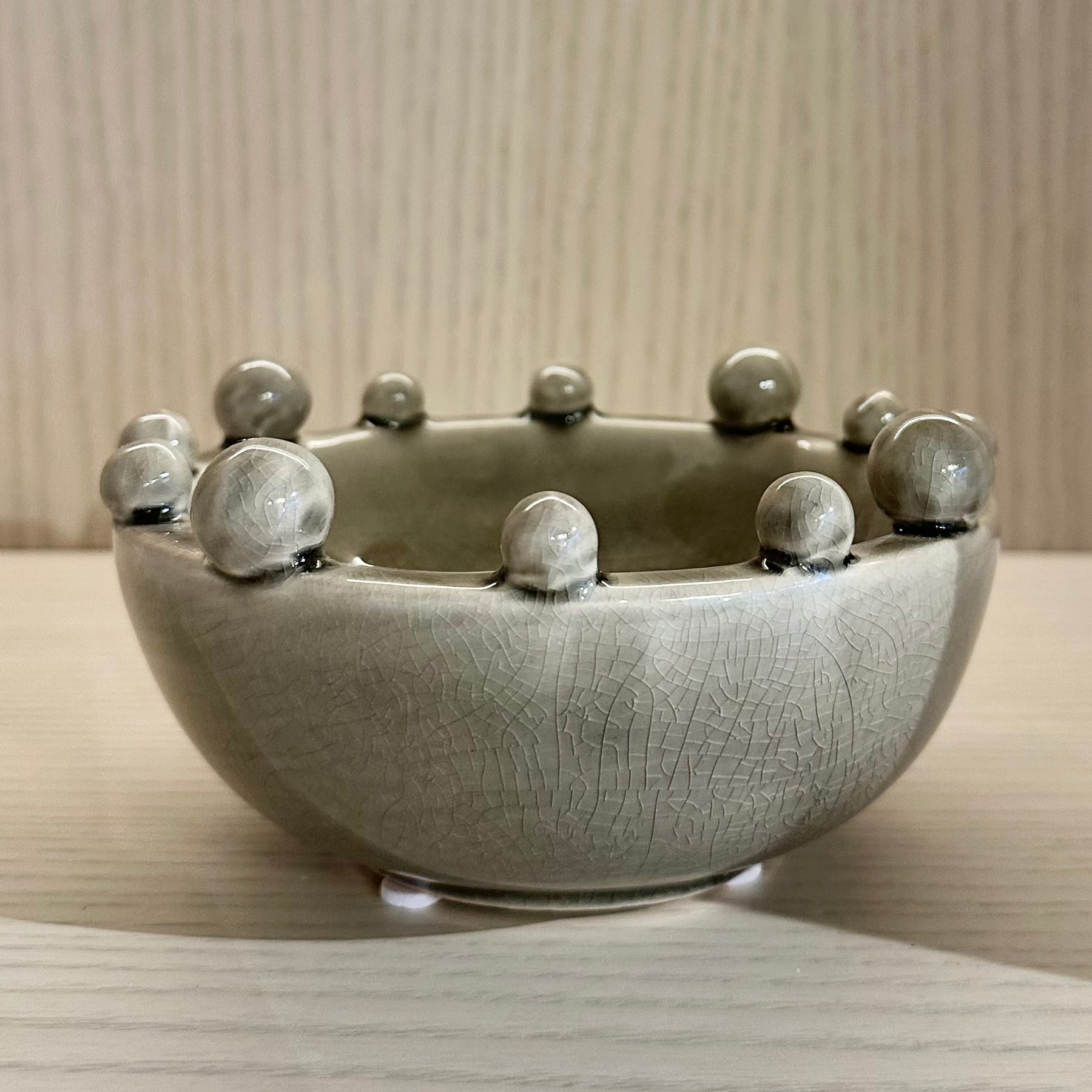 Contemporary and refined, the Mini Grey Trinket Bobble Bowl adds a sculptural statement to any surface. The soft grey tone and raised bobble detailing create a modern, tactile finish — perfect for styling on bedside tables, consoles, or shelving.