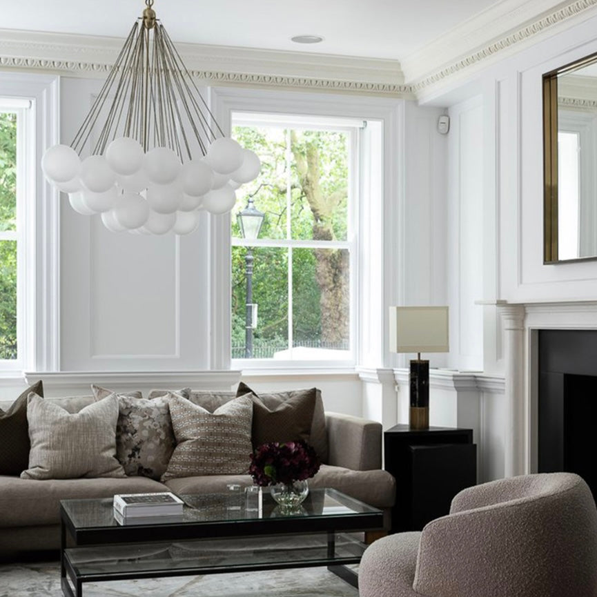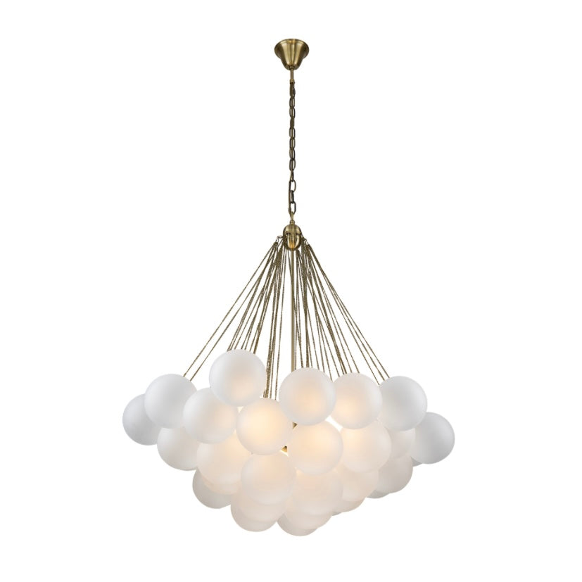 Illuminate your space with the Cloud Pendant Lamp, where ethereal design meets sophisticated elegance. Featuring an antique brass finish, this captivating fixture showcases fluffy, cloudy glass shades elegantly suspended from linked brass bracelet chains. Perfect as a show-stopping centerpiece, it requires three E14 bulbs (not included) for stunning illumination.