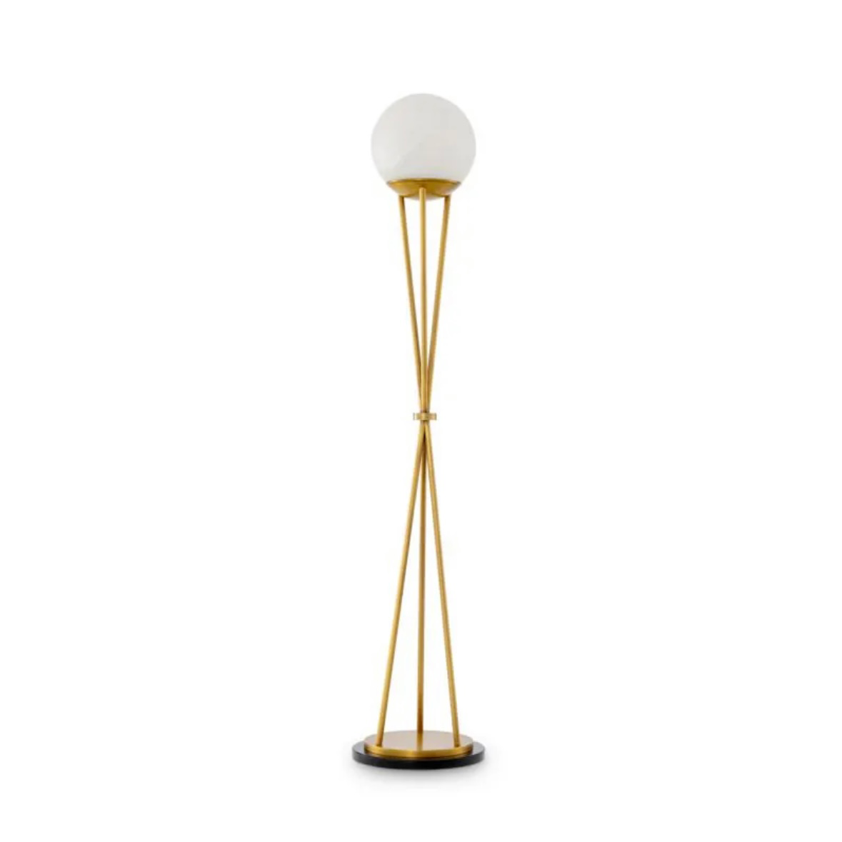 A refined balance of sculpture and light, the Izzy Floor Lamp pairs a softly glowing alabaster globe with a slender tripod base in warm brass. The tapered rods meet at a central ring, creating a poised, architectural silhouette inspired by mid-century design.