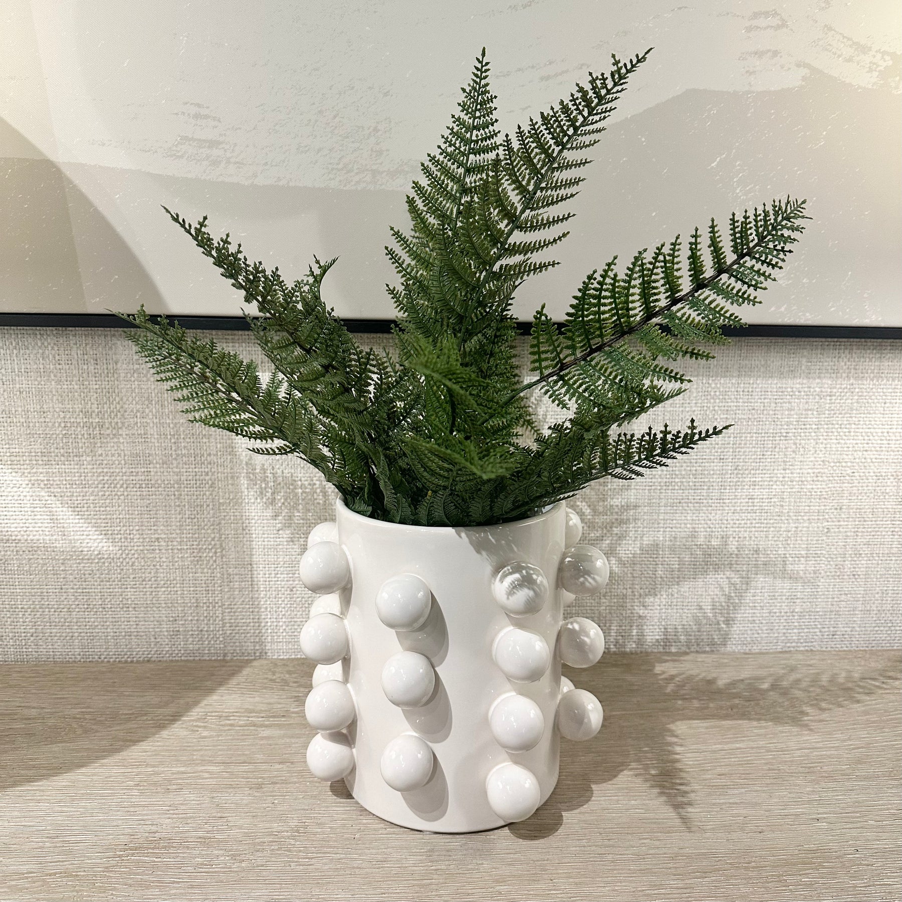 With its sculptural form and tactile design, the white Bobble Vase is a statement piece that blends modern elegance with playful texture. Crafted in a soft, neutral cream tone, its unique bobble detailing adds depth and character, making it a striking addition to any space. Perfect for displaying fresh or dried flowers, or styled alone as a decorative accent, this vase effortlessly complements contemporary and minimalist interiors. A beautiful blend of artistry and function for your home.