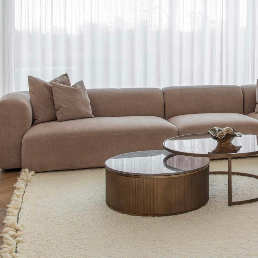 Combining elegant form with practical function, the Royal Belvedere Nesting Coffee Tables bring a layered look to contemporary living. The larger table features a brown tinted glass top, while the smaller nests beneath with a solid slab of Italian Royal Gold marble. The curved, fluted bases in smoked gold-finished metal add texture and warmth. Designed to work together or apart, this set offers both style and flexibility. The marble top is carved from natural Italian stone, meaning each piece showcases unique veining and tonal variations that enhance its individual beauty.