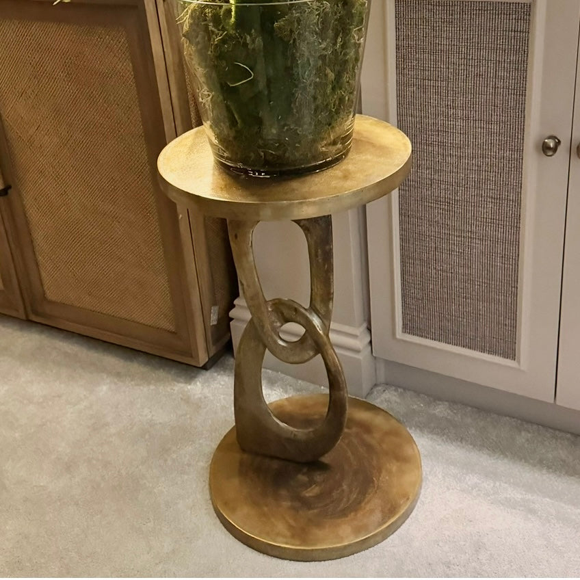 Elevate your living space with the sculptural elegance of our Burnish Pewter Link Side Table. Designed with an interlocking chain-link pedestal and a beautifully burnished pewter finish, this statement piece combines artful form with everyday function.