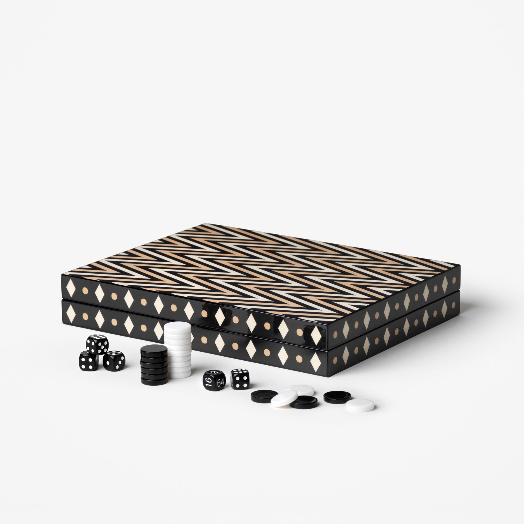Discover the Lacquered Backgammon Set in a striking eclectic pattern of black, white, and cream. This bold edition blends timeless gameplay with expressive design, featuring a large wooden board and glossy acrylic pieces. Both a game and a statement piece, it adds character whether in play or on display.