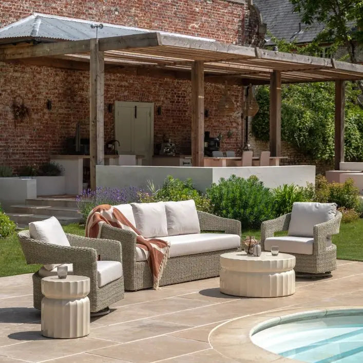 The ridged base and segmented top add texture and visual interest, while the soft cream finish keeps the look light, contemporary and easy to style. Perfect for anchoring an outdoor lounge setup, Cirella pairs beautifully with neutral upholstery, woven textures and natural stone surroundings.