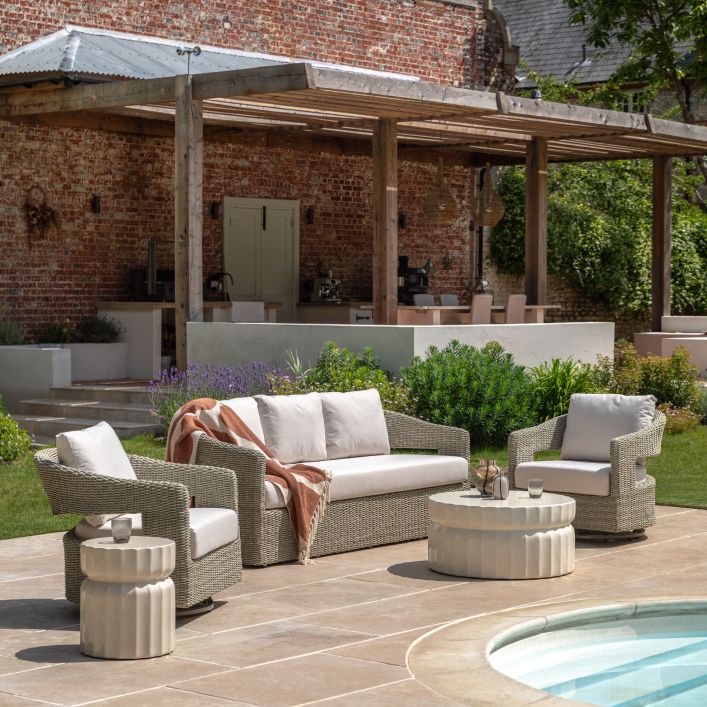 The ridged base and segmented top add texture and visual interest, while the soft cream finish keeps the look light, contemporary and easy to style. Perfect for anchoring an outdoor lounge setup, Cirella pairs beautifully with neutral upholstery, woven textures and natural stone surroundings.
