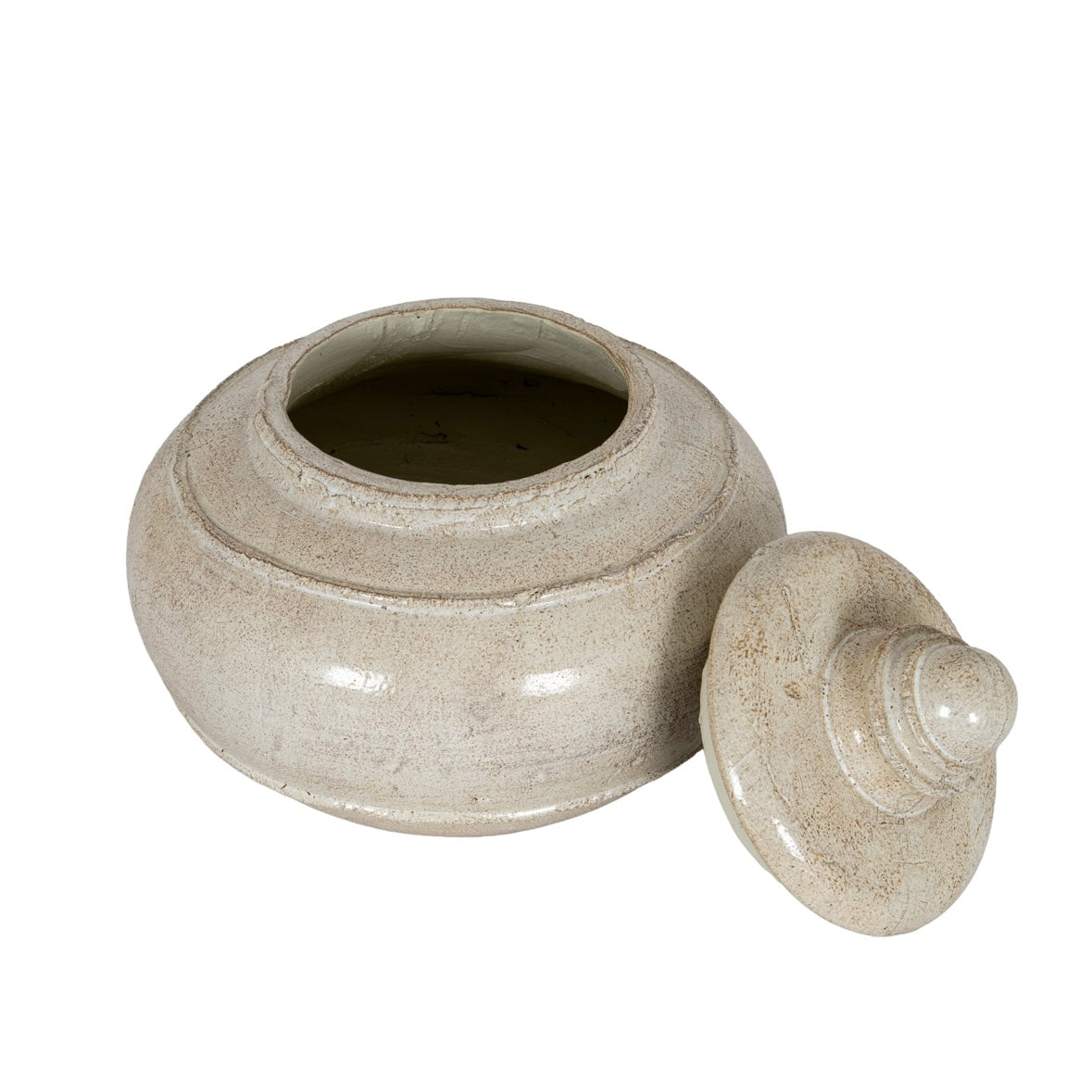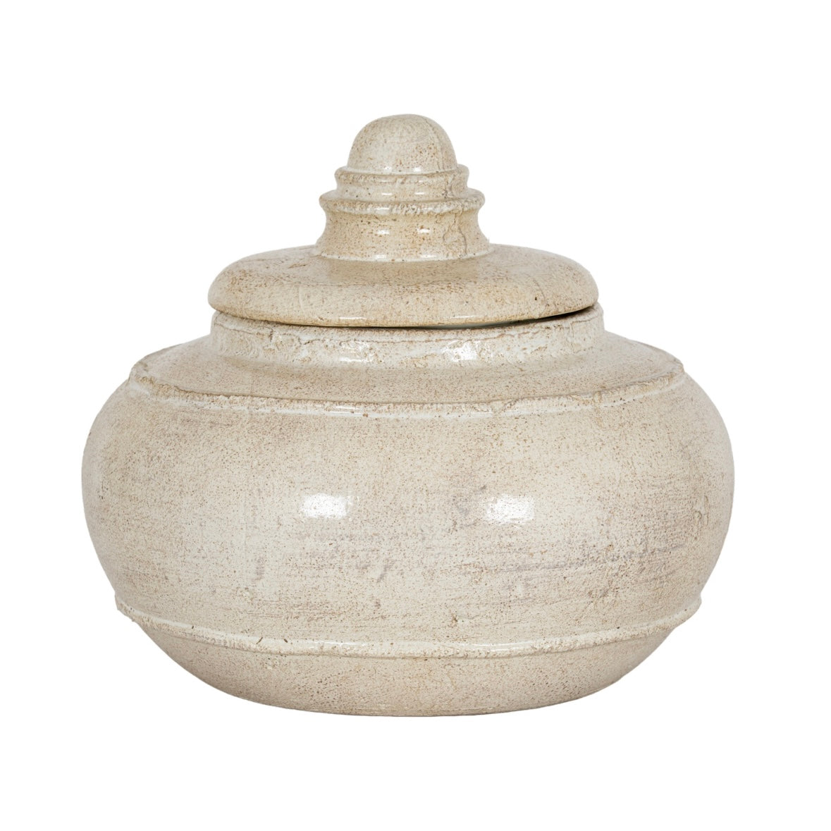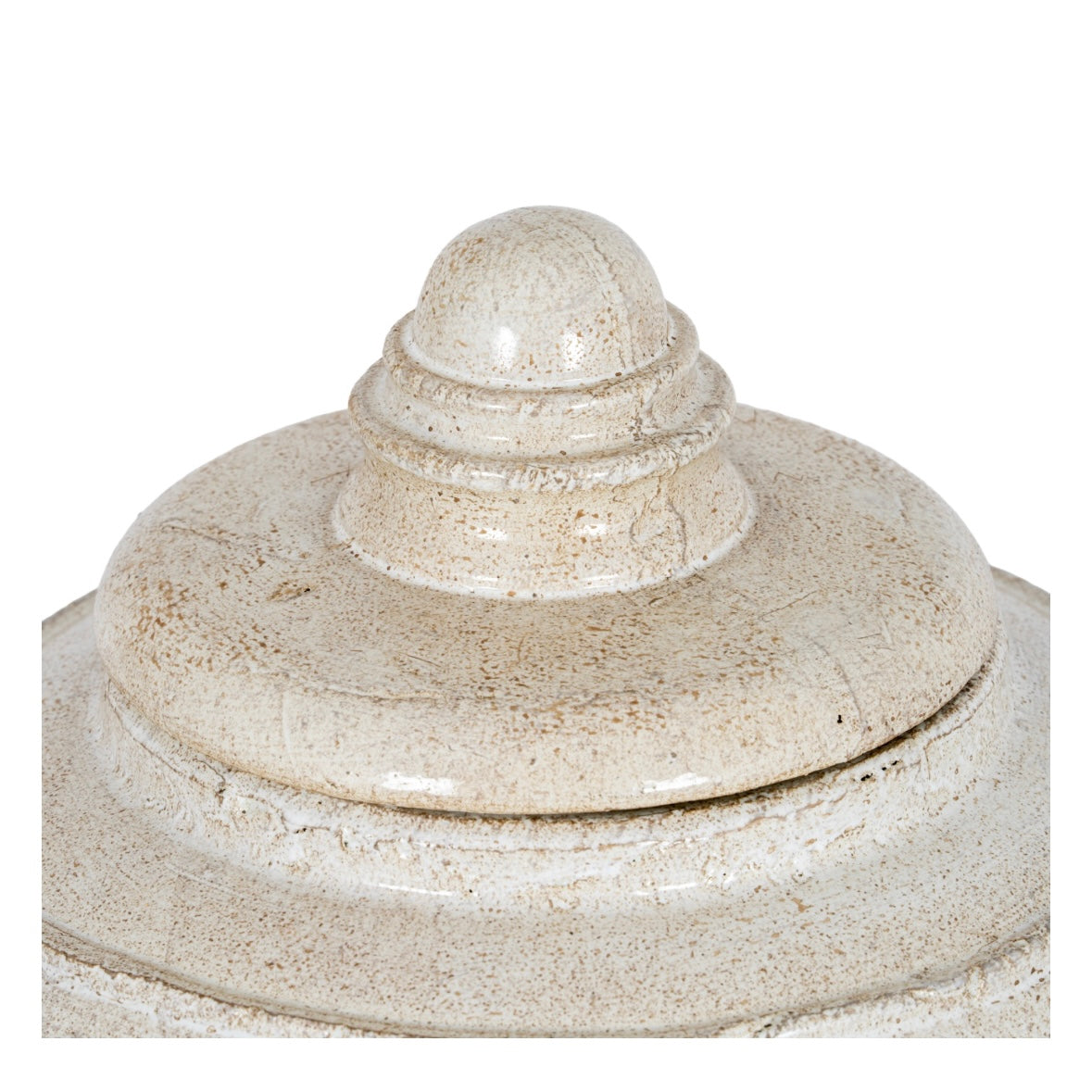 Featuring a classic rounded silhouette and matching lid with subtle detailing, it creates an elegant, Mediterranean-inspired look. The neutral tone and textured surface make it ideal for styling on consoles, kitchen shelving or coffee tables.
