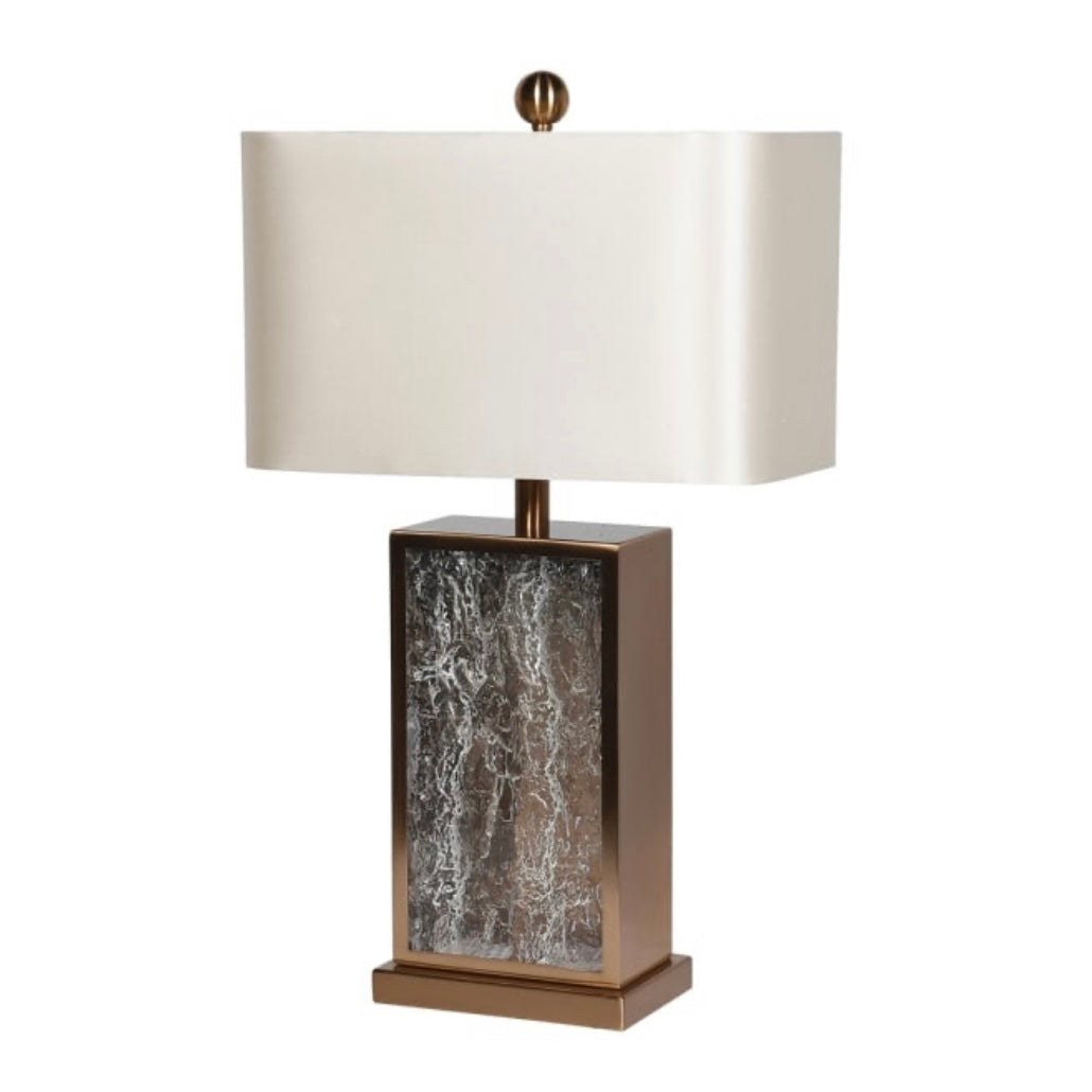 Sophisticated and striking, this table lamp features a rectangular bronze base with a marble-effect inset and a classic cream shade. The warm metallic finish and bold silhouette make it a perfect statement piece for bedside tables, consoles, or desks.