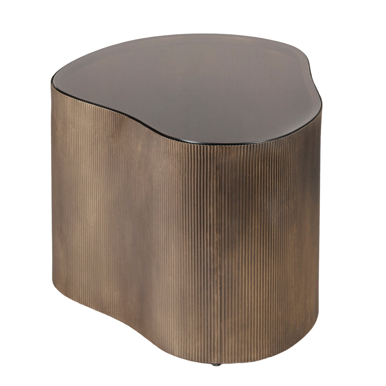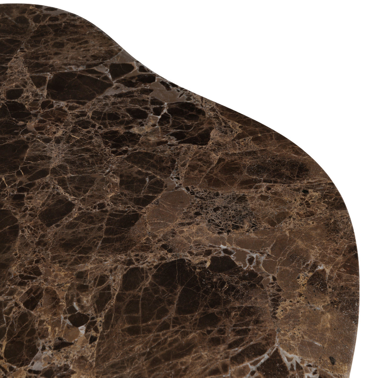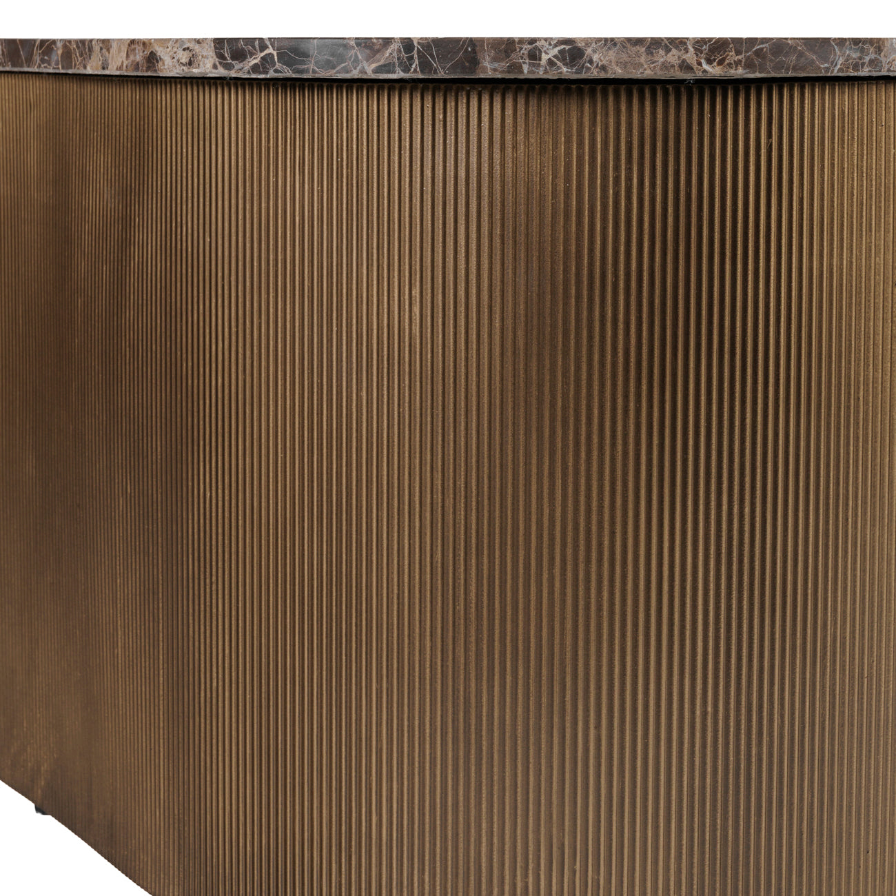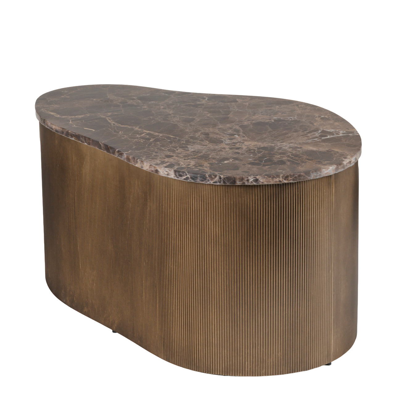 A sculptural pairing that speaks to organic form and material richness, the Cloud Coffee Table Set blends tactile intrigue with timeless sophistication. The larger table is crowned with Italian Emperador marble, with every piece completely unique due to natural form, while the smaller features warm brown-tinted glass, subtly reflecting the light. Both are encased in a corrugated metal base finished in burnished gold, lending texture and depth. Crafted using hand-distressed techniques and precise metalwork, these tables celebrate the intersection of form and function.