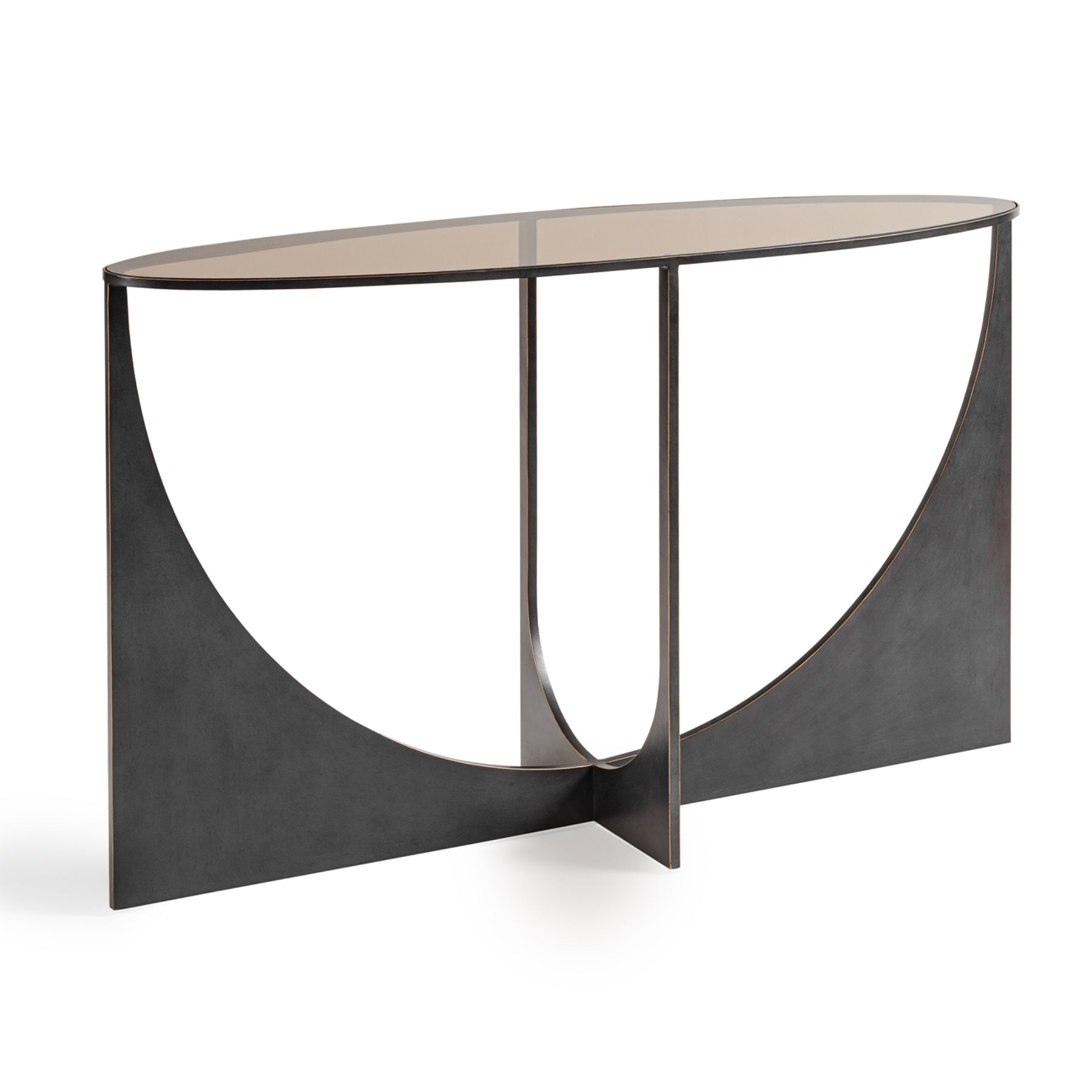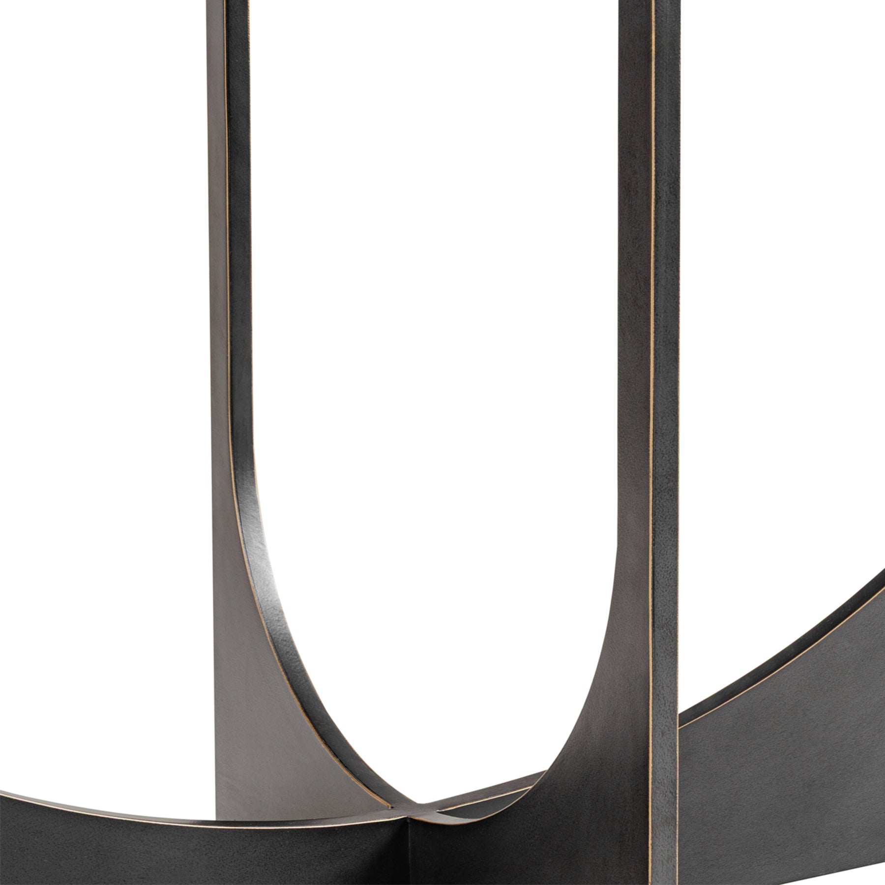 The Glenthorpe Console Table is a sculptural composition of brown-tinted glass and laser-cut iron, finished in hand-applied gilded oak wood. Its sweeping arched base and intersecting curves reflect the growing appreciation for architectural furniture that brings presence without overpowering a space. The pairing of warm metal tones with smoked glass echoes today’s move towards richer neutrals and refined, darker palettes, adding depth and quiet sophistication to contemporary interiors.