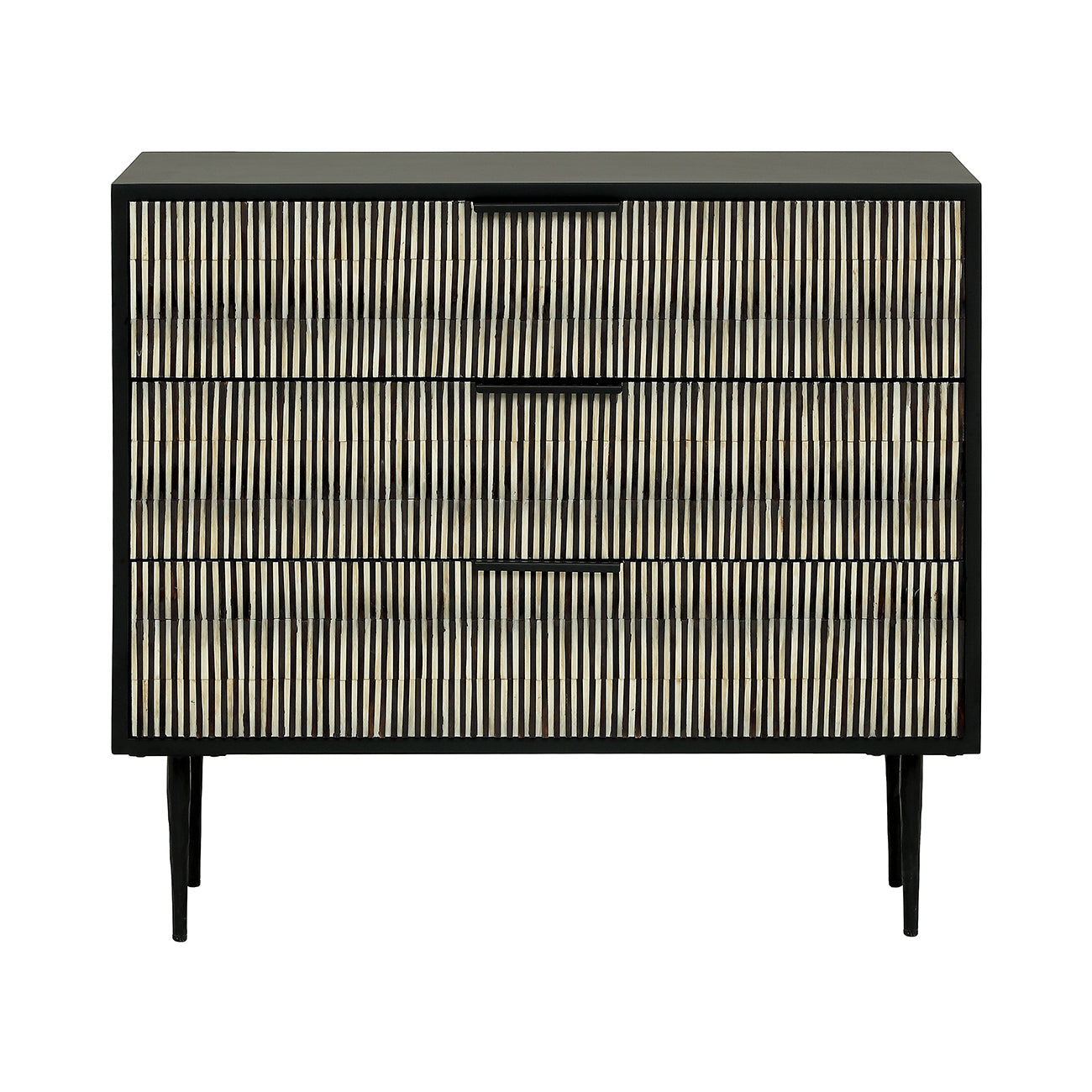 Elegant and sculptural, the Imperia Bone Inlay Chest brings depth, texture and modern artistry to contemporary interiors. Its three handcrafted drawer fronts feature a raised, rhythmic black-and-ivory bone pattern that plays with light and adds subtle movement. A matte black frame and slim legs ground the piece with quiet glamour and a clean, modern silhouette. Generous storage keeps spaces calm and ordered, while the tactile façade reflects today’s focus on sculptural surfaces and refined simplicity.