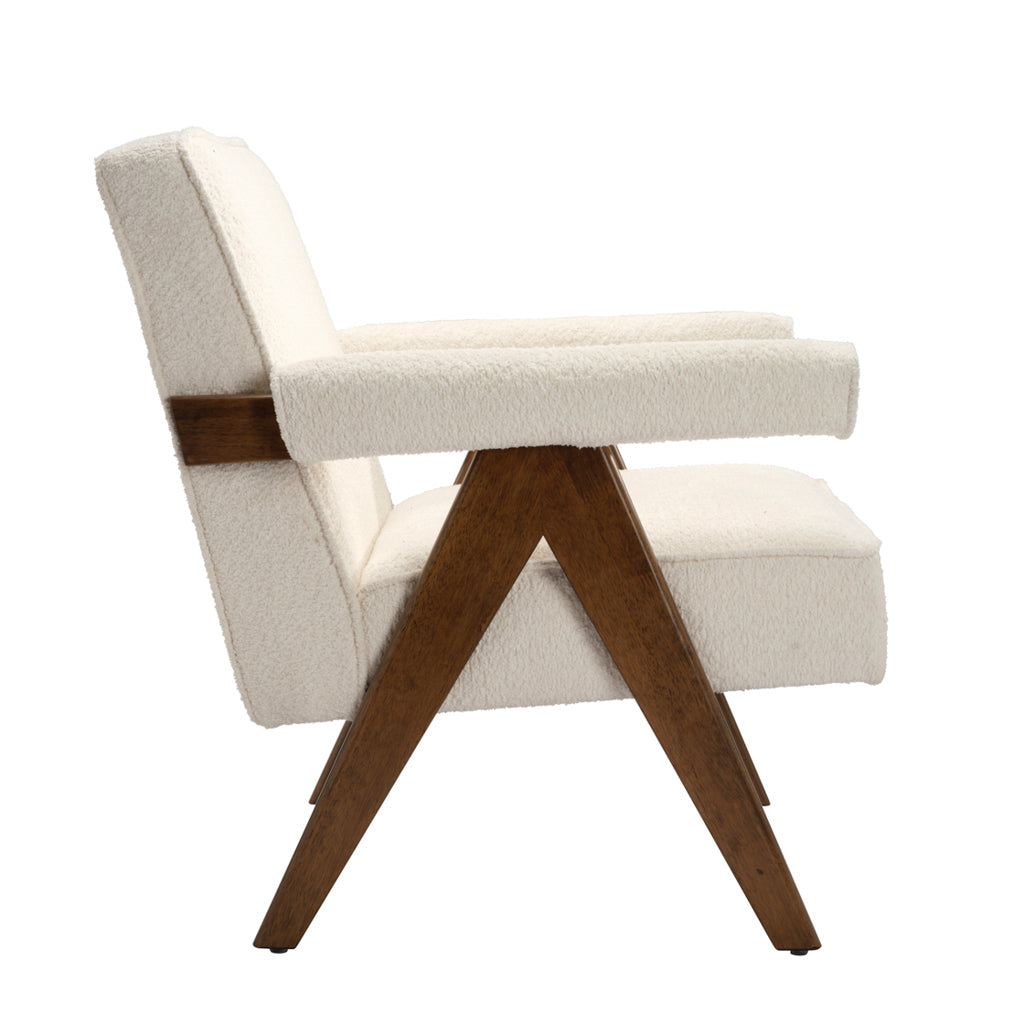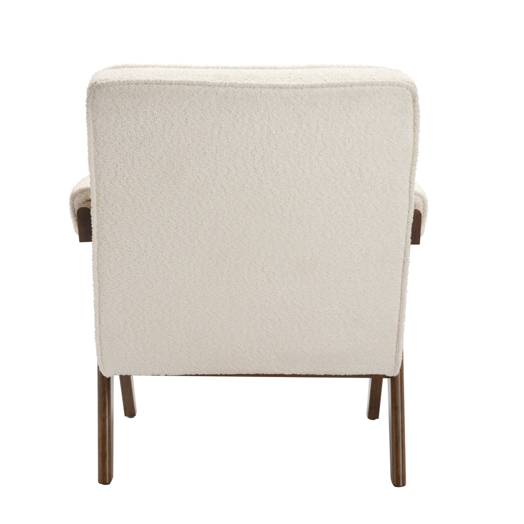 Featuring padded upholstered arms and rich walnut-coloured wooden legs, it offers both comfort and structural elegance. The clean-lined silhouette makes it perfect as a living room accent chair, bedroom occasional chair, or stylish reading chair.