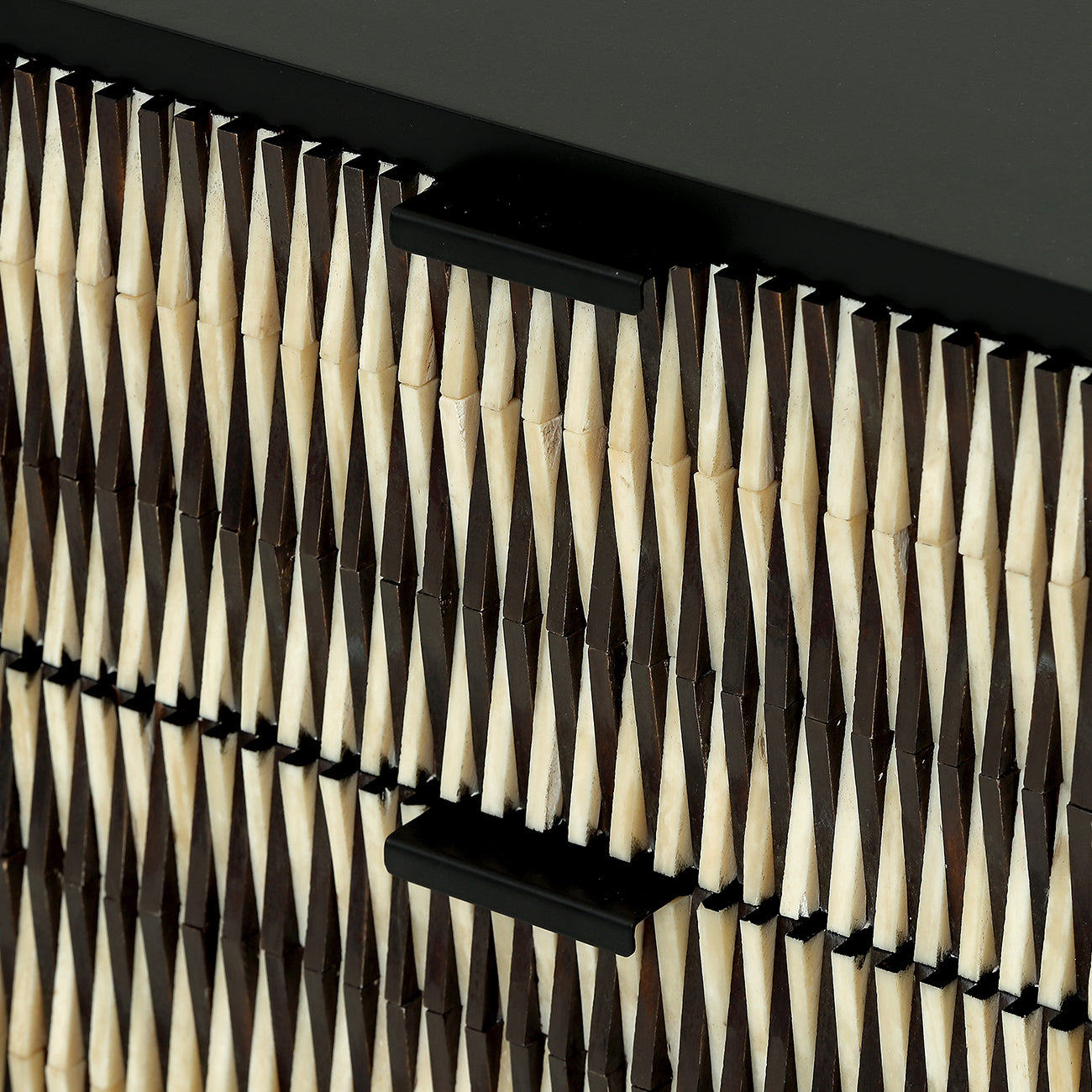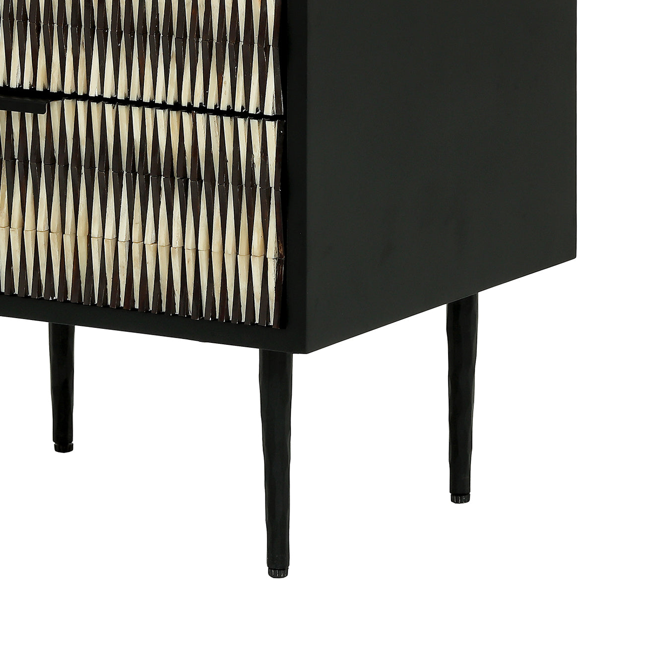 Elegant and sculptural, the Imperia Bone Inlay Bedside brings depth, texture and modern artistry to contemporary interiors. Its handcrafted drawer fronts feature a raised, rhythmic black-and-ivory bone pattern that plays with light, echoing today’s focus on sculptural surfaces and tactile materials. A matte black wooden frame and slim iron legs add quiet glamour, while compact storage keeps spaces calm and ordered.