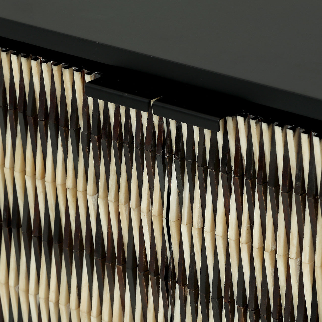 Refined and sculptural, the Imperia Bone Inlay Sideboard brings depth and modern artistry to contemporary interiors. Its handcrafted doors feature a raised, rhythmic black-and-ivory bone pattern that plays with light, echoing today’s focus on sculptural surfaces and tactile materials. A matte black frame and slim legs ground the piece with quiet glamour, while generous storage keeps spaces calm and organised.
