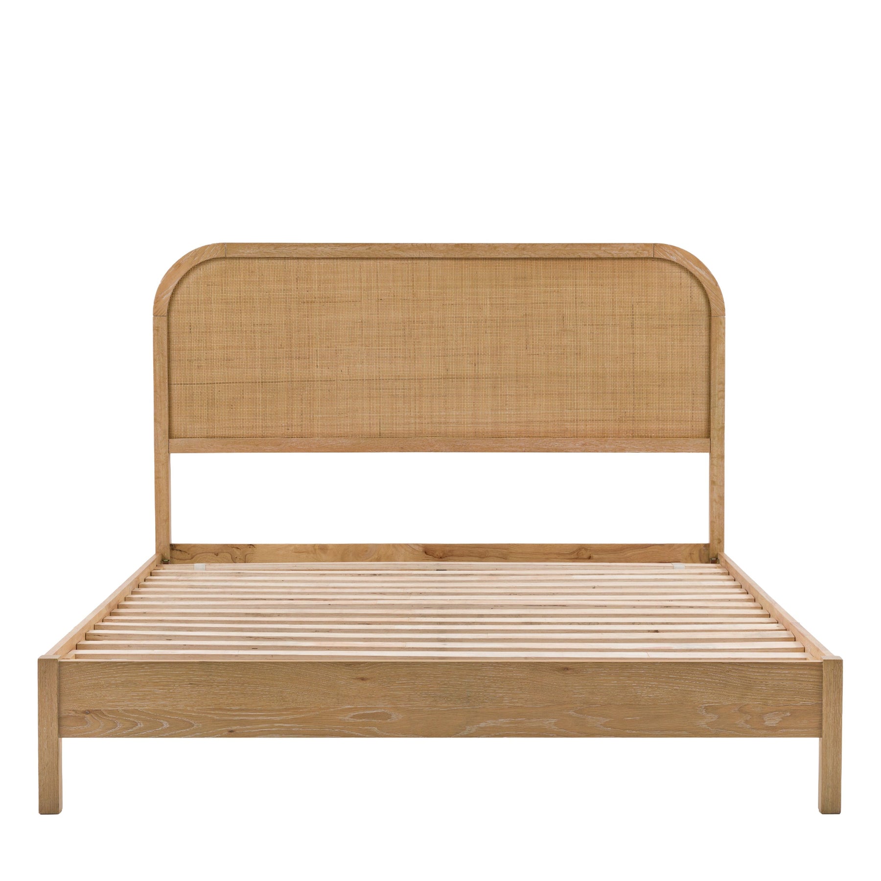 Bring a touch of rustic charm with this beautifully crafted bed; blending oak solids, veneers, and solid rubberwood timbers for durability and warmth. The standout feature being the natural hand-woven rattan panels on the headboard, adding texture and an artisanal feel. Finished in a soft lime-washed tone, the collection has a relaxed, lived-in character. Gently curved tops lend a sense of softness. Perfect for creating a calming, timeless bedroom space with natural beauty at its heart.