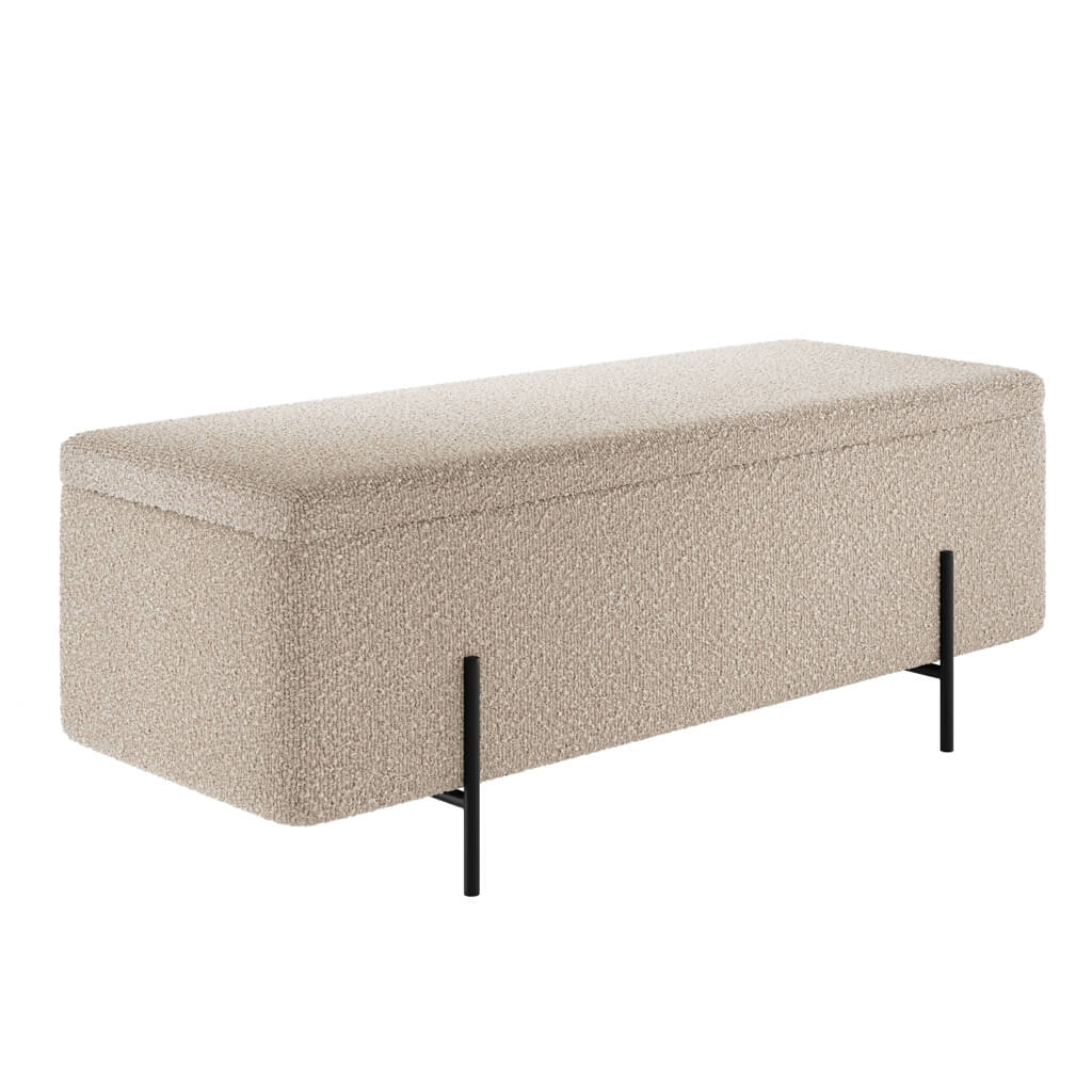 Add style and practicality to your space with the Lola Buff Storage Ottoman. Upholstered in soft buff bouclé fabric, this contemporary storage ottoman brings warmth and texture to modern and neutral interiors. The clean rectangular silhouette is elevated by sleek matte black legs, creating a refined contrast that suits both living rooms and bedrooms.