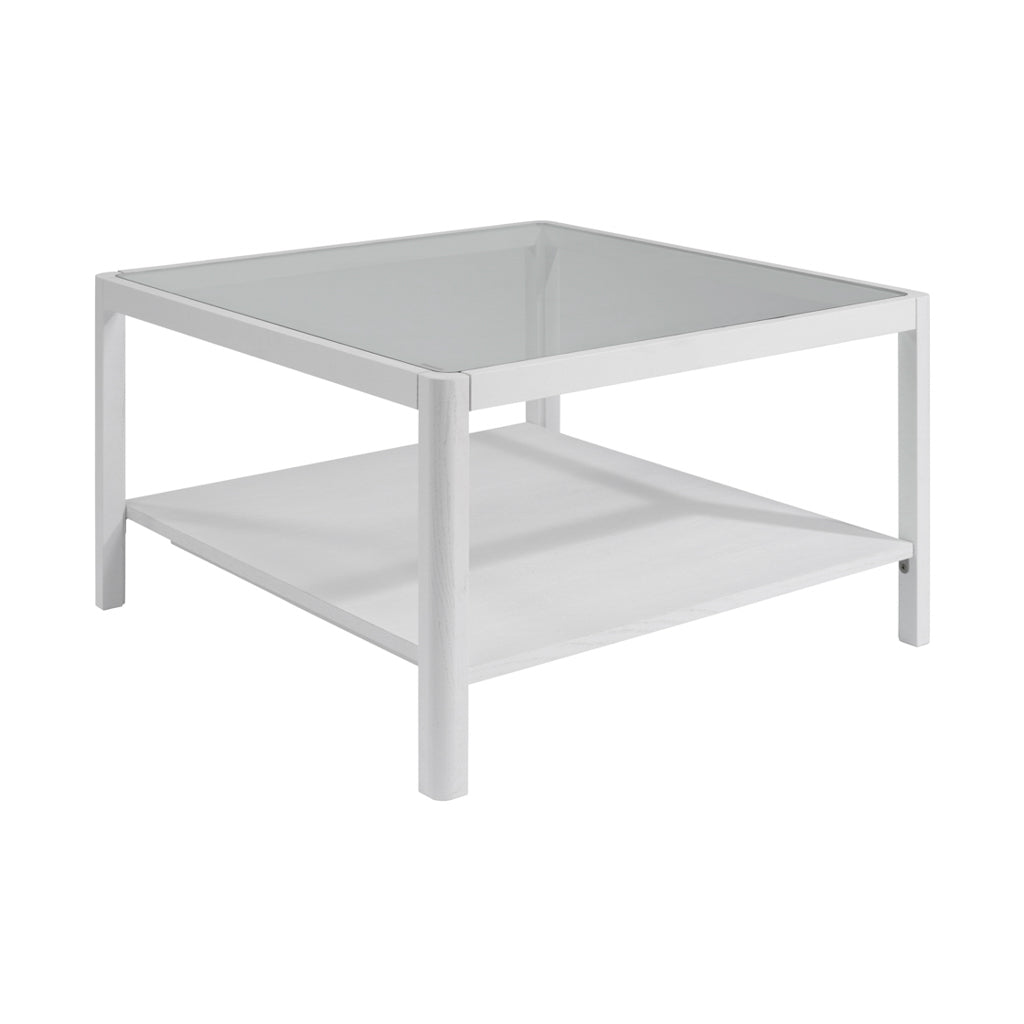 This white coffee table with glass top combines a matte grain white frame with a sleek tempered glass surface, creating a light and modern living room table ideal for contemporary interiors. The integrated lower shelf offers practical storage for books, magazines and decorative accessories, making it as functional as it is stylish.