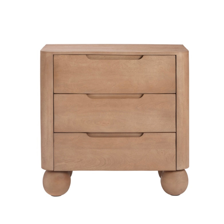 Crafted from solid mango wood, the Shibui Almond Chest of Drawers combines natural texture with contemporary design. Featuring softly curved edges and statement ball feet, this wooden storage chest brings sculptural character and warmth to modern interiors.