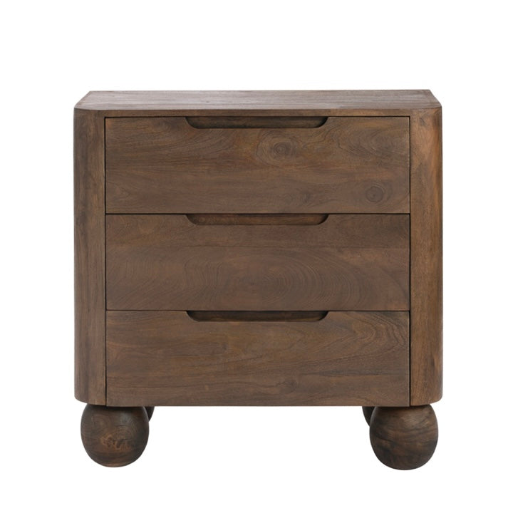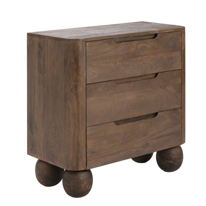 Crafted from solid mango wood, the Shibui Light Brown Chest of Drawers blends natural warmth with contemporary design. Featuring softly curved edges and distinctive statement ball feet, this wooden chest brings sculptural detail and modern character to any bedroom or living space.