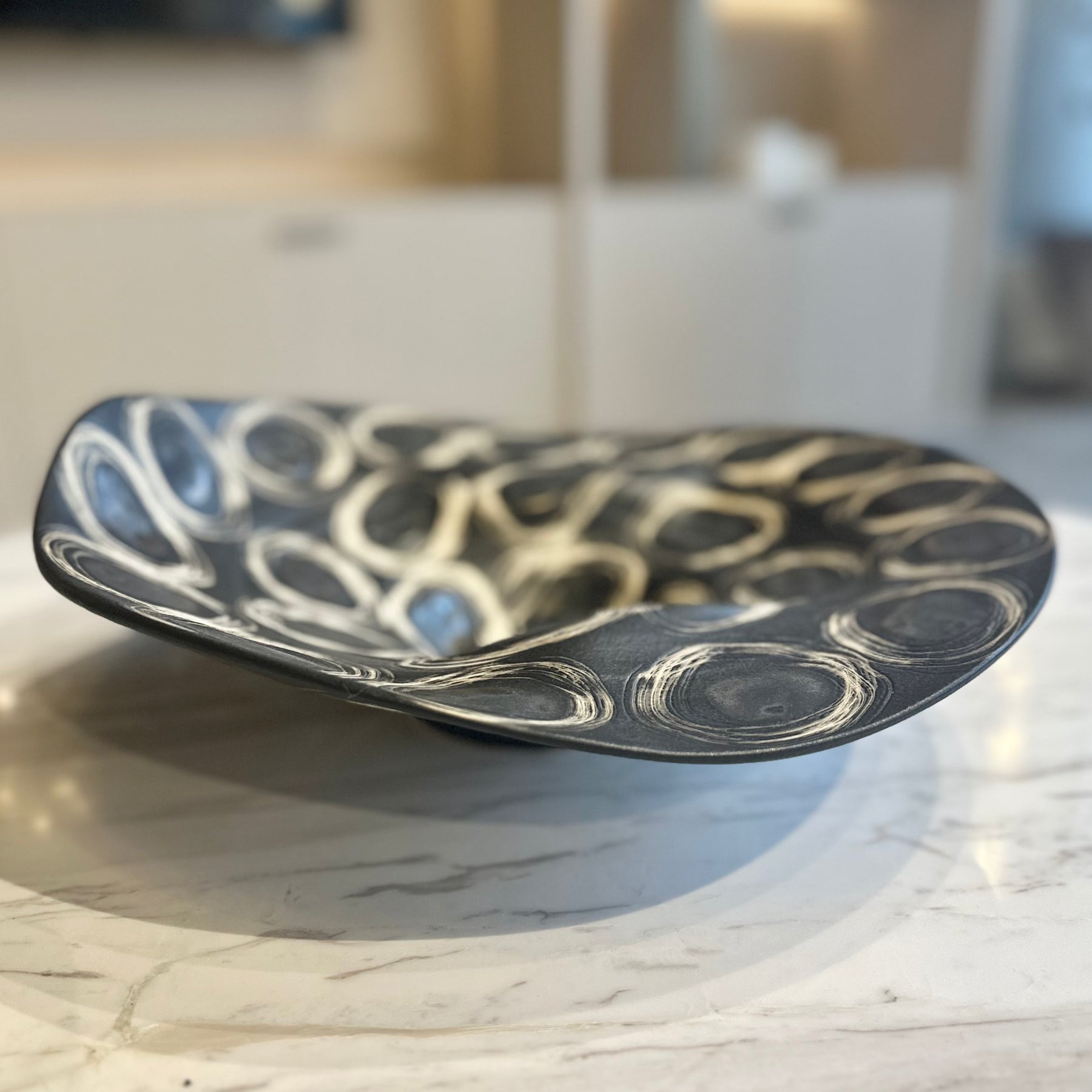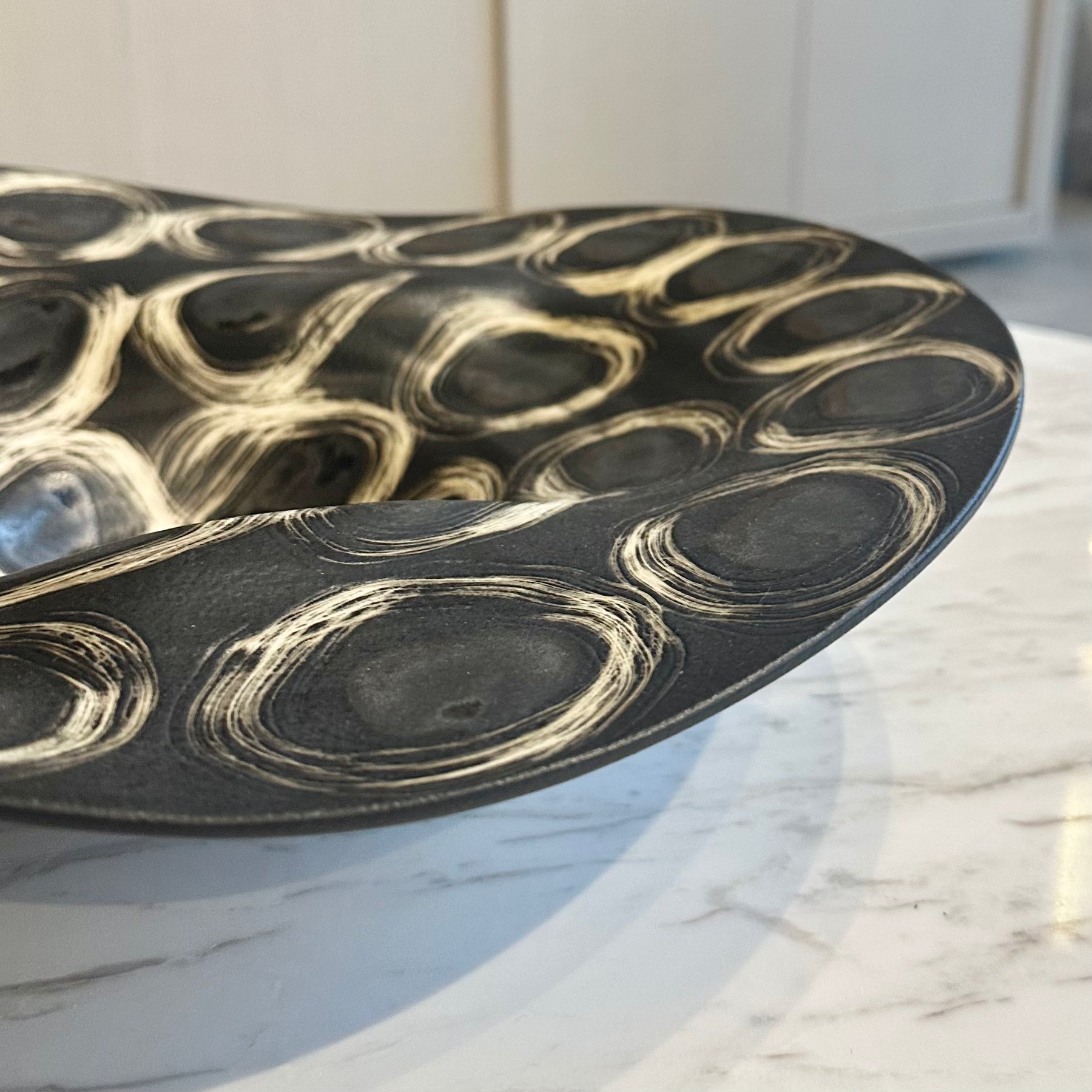 A beautifully artistic decorative plate featuring a striking noir and blanc finish with an organic, abstract pattern. The gently curved shape and textured surface give this piece a sculptural feel, making it just as stunning displayed on a console or coffee table as it is styled as part of a tablescape.