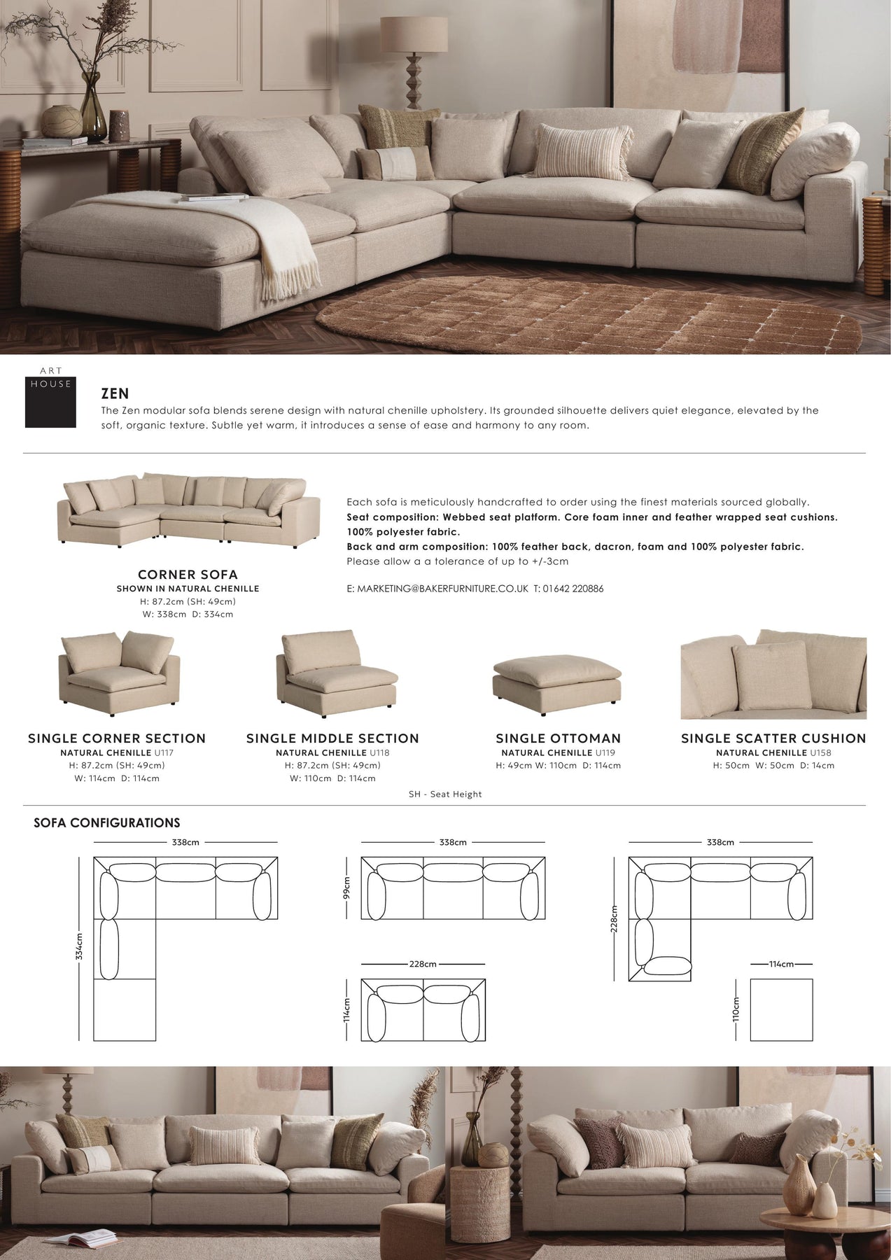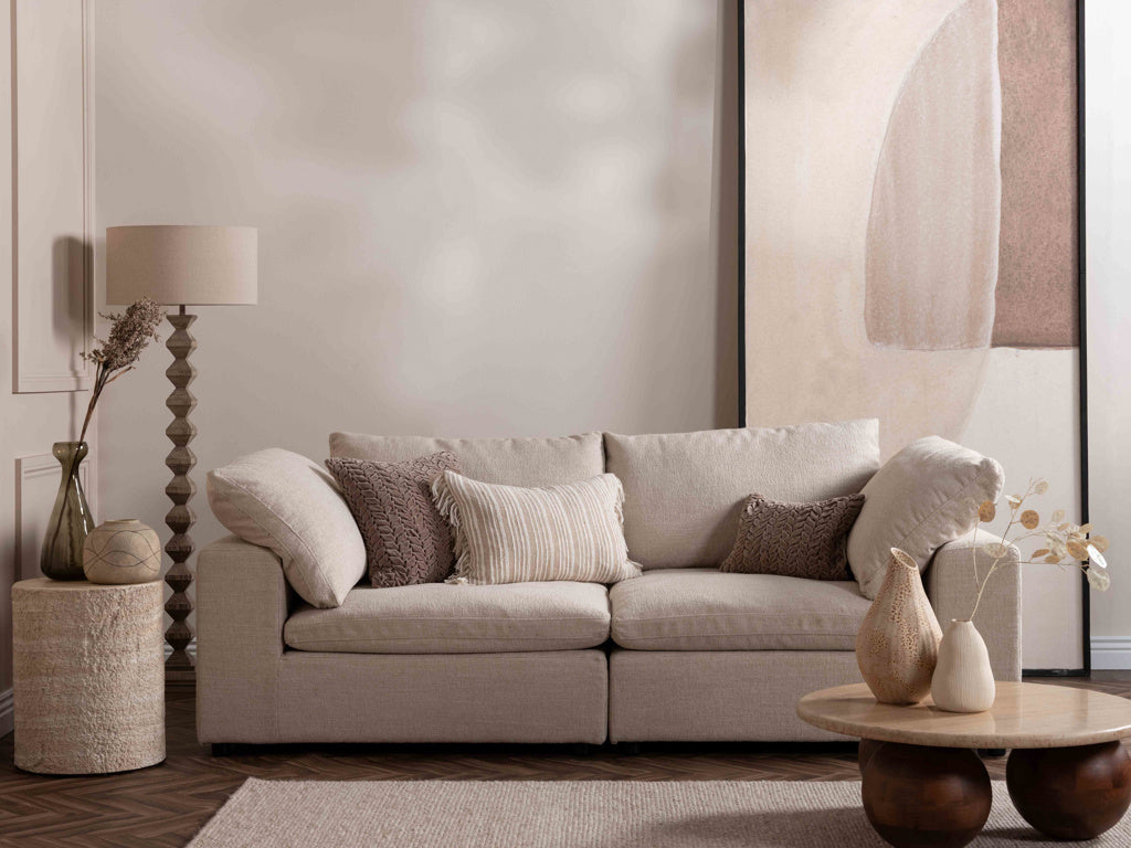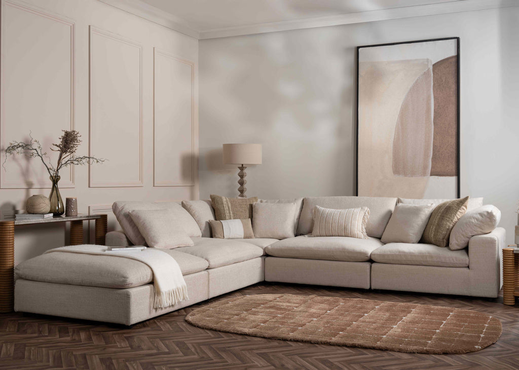 The Zena modular sofa is designed for relaxed comfort and versatile living. Featuring luxurious feather-filled seat cushions, it offers a beautifully soft, sink-in feel while maintaining an inviting, stylish shape.