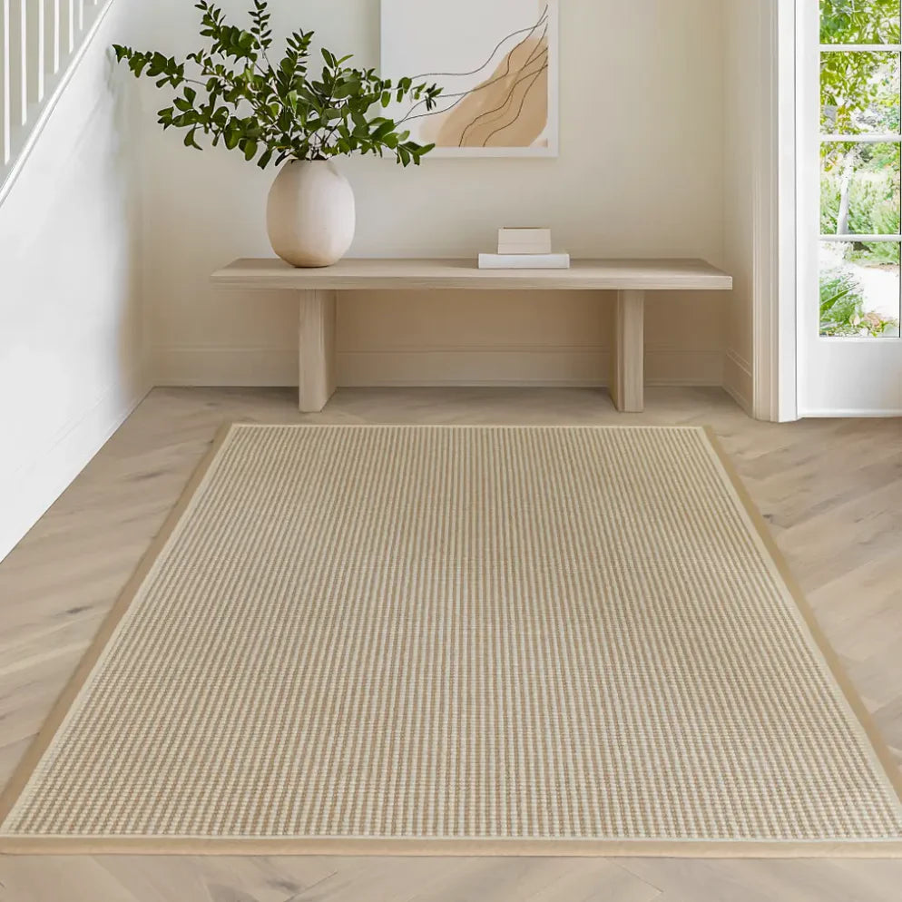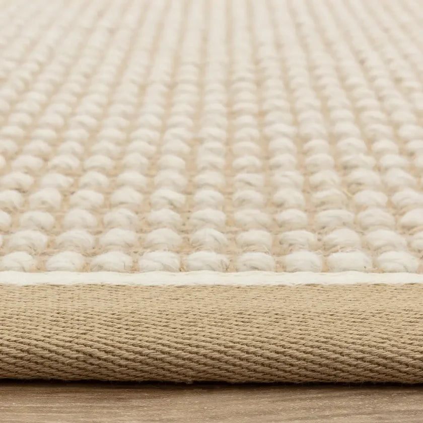 The Korra Loop Rug is power-loomed from a durable blend of wool and jute, finished with a contrasting linen border for subtle definition. Its low loop pile and neutral tones make it a versatile choice for living spaces, bedrooms and hallways, offering texture without overpowering the room.