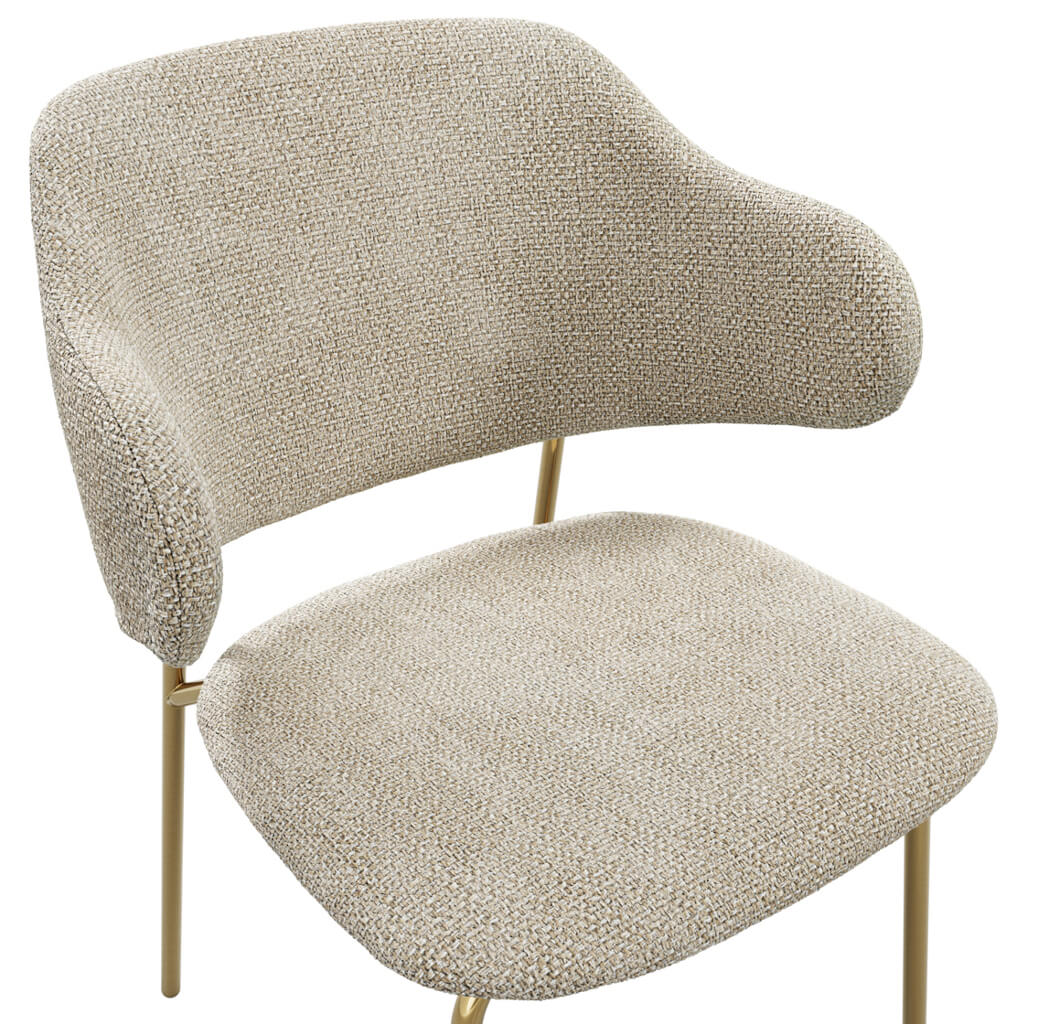 Upholstered in a soft wheat-toned fabric, the Dorchester Dining Chair features a gently curved back and plush seat for comfort, set on sleek gold-finished legs for a touch of glamour.