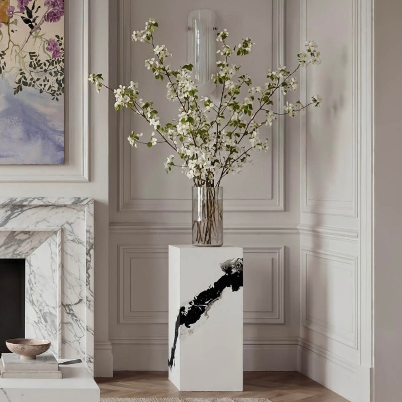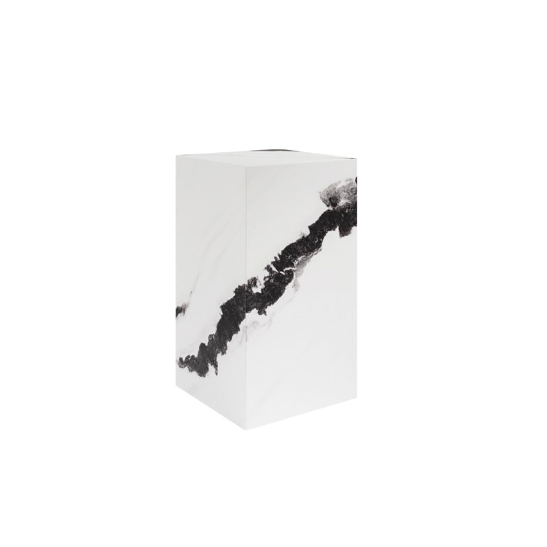 Make a bold design statement with the Sur Panda Small Pedestal, a striking accent piece that blends sculptural form with contemporary elegance. Featuring a clean white finish with a dramatic black marble-inspired vein running across the surface, this pedestal creates a sophisticated focal point in any interior.